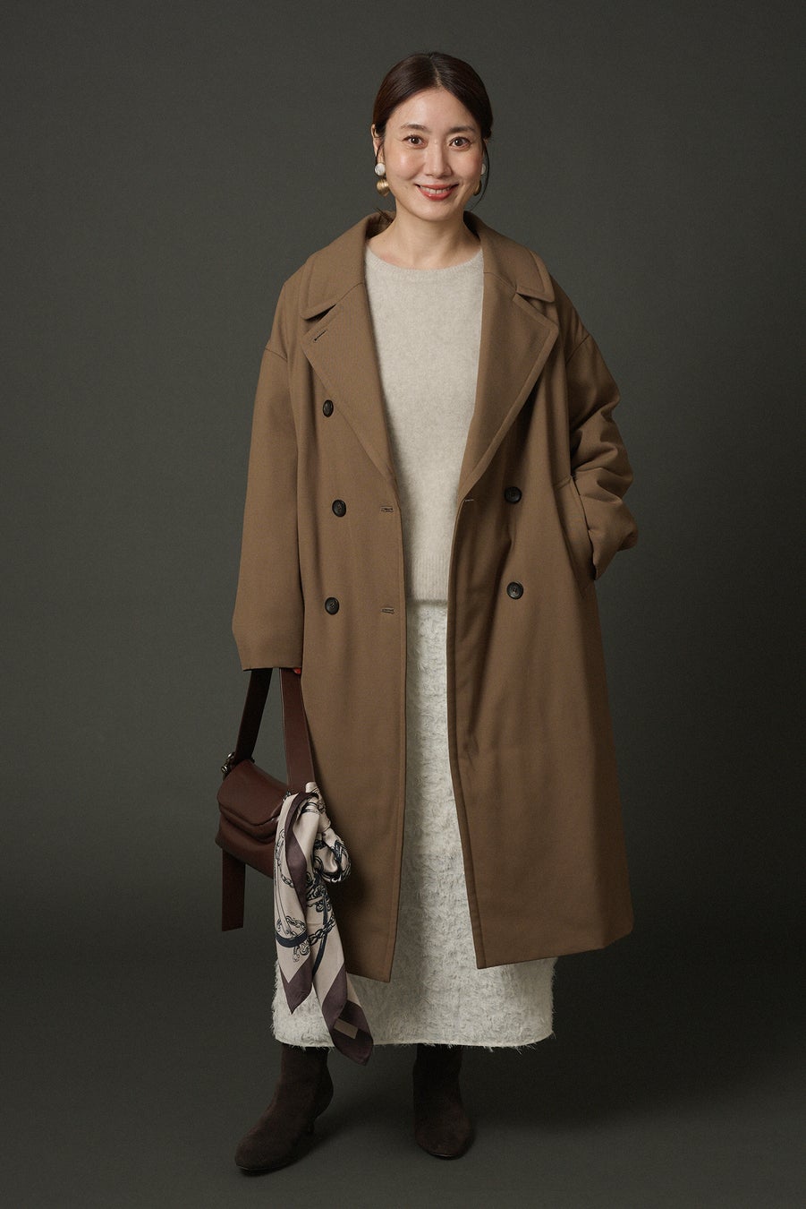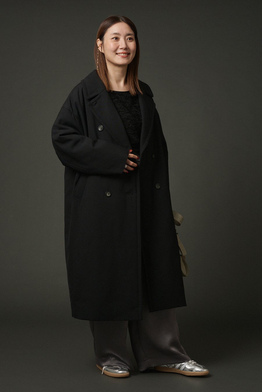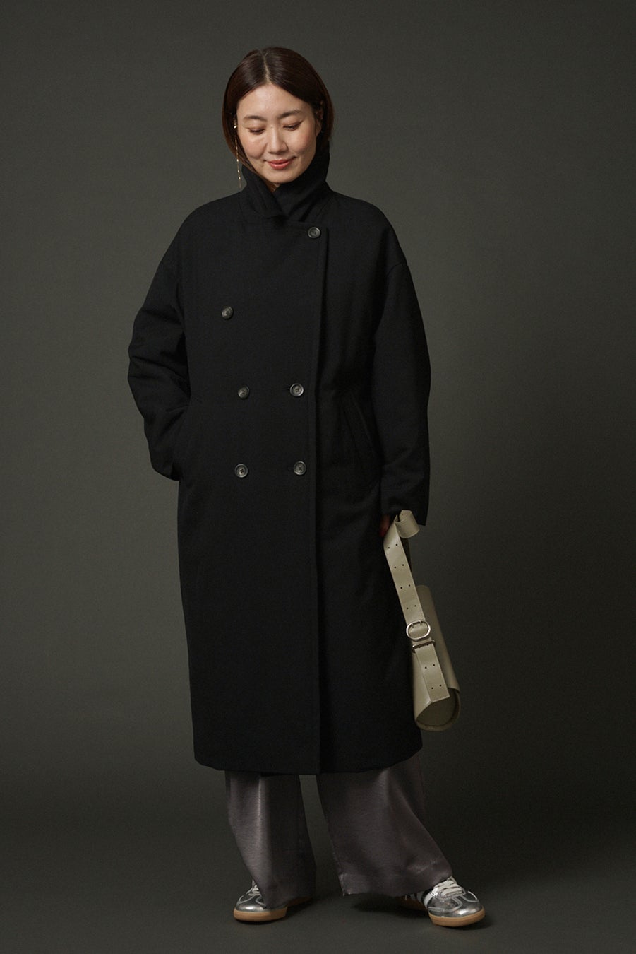 カジュアルになりがちな中綿撥水コートですが、普段のきれいめな着こなしにも馴染むようスーツ地のように上品な印象を与える美しい梳毛の素材を使用。さらに撥水加工も施しました。初冬から羽織れ、アームホールにゆとりを持たせたデザインなので厚手のニットの上からもごわつかず、真冬でも快適に着用いただけます。オーバーサイズなので、シーンや体型、スタイリングを選ばず着られる万能コートです。