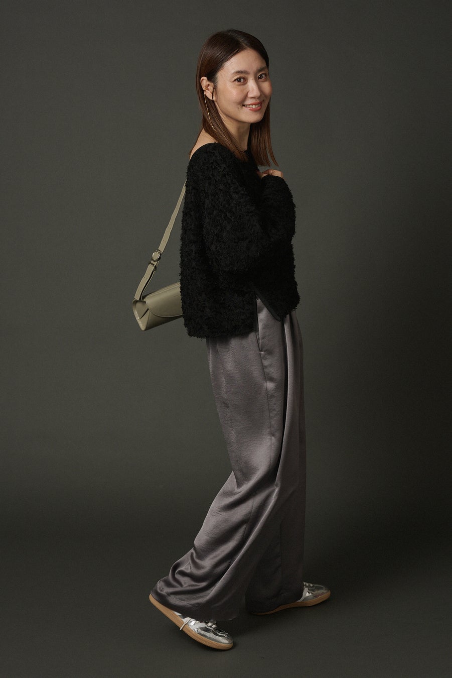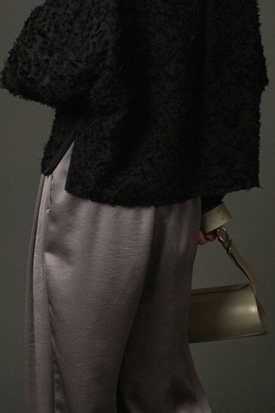 黒のブラウスですが、女性らしい襟周りと華やかなフェザージャガードなので、グレーのパンツを合わせてもカジュアルになり過ぎず女性らしい雰囲気に。ブラウスのサイドはジップ仕様なので、開けて着るとパンツとのバランスがよく、脚長効果もあります。