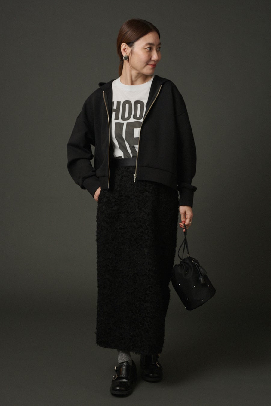 あえて黒をカジュアルに着こなしたスタイリング。エレガントなタイトスカートに、大きめなロゴのメッセージTシャツとパーカーで着くずすことで ちょっとモードで抜け感のある印象に。小物も黒で統一。素材や質感が違う黒を組み合わせるのがポイントです。