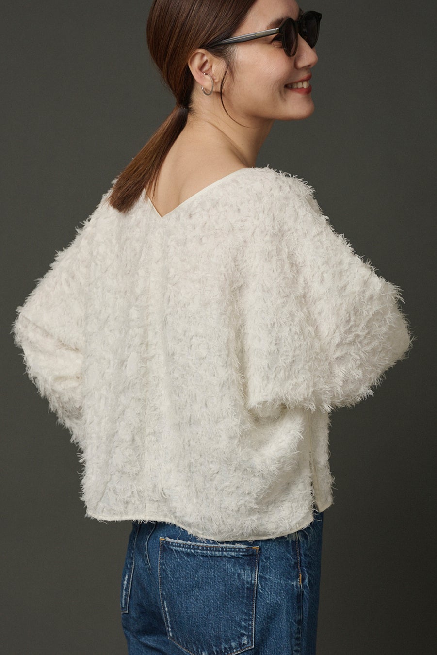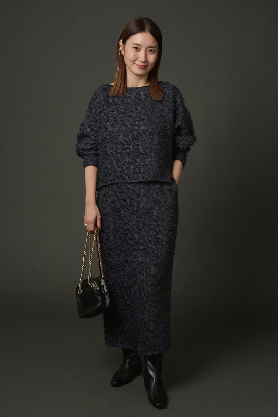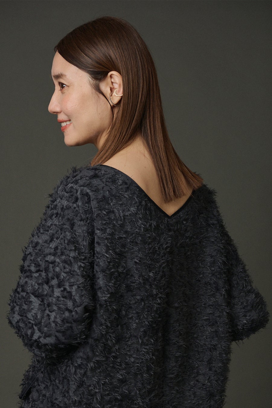 ほのかに透け感があり、華やかなフェザージャガードを、カジュアルからフォーマルまでシーンレスに楽しめるブラウスです。妙子さんが特にこだわったのは襟元のデザイン。デコルテとバックスタイルが、一番きれいに見える絶妙なバランスを、何度も何度も試行錯誤しながら仕上げた究極の一枚です。