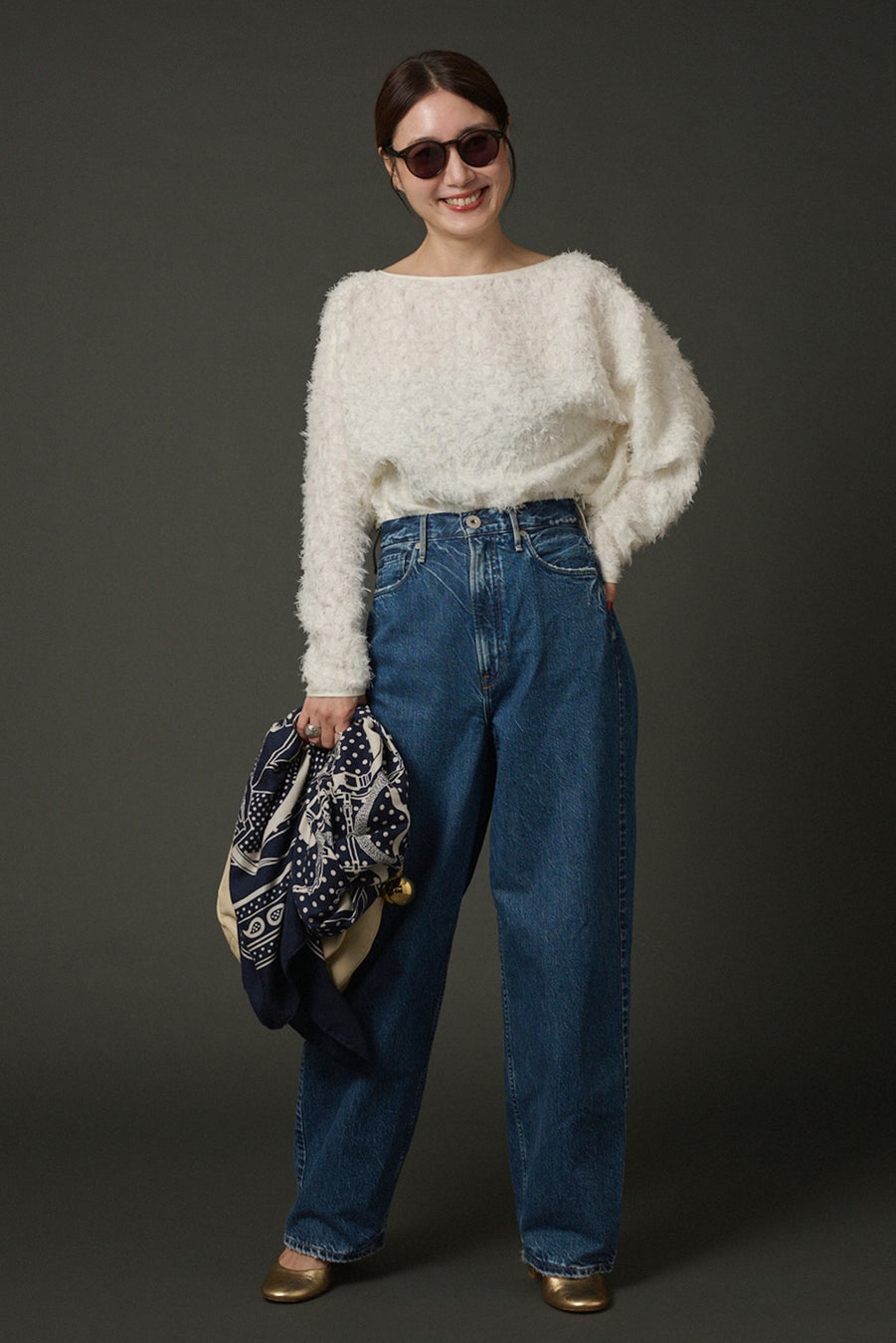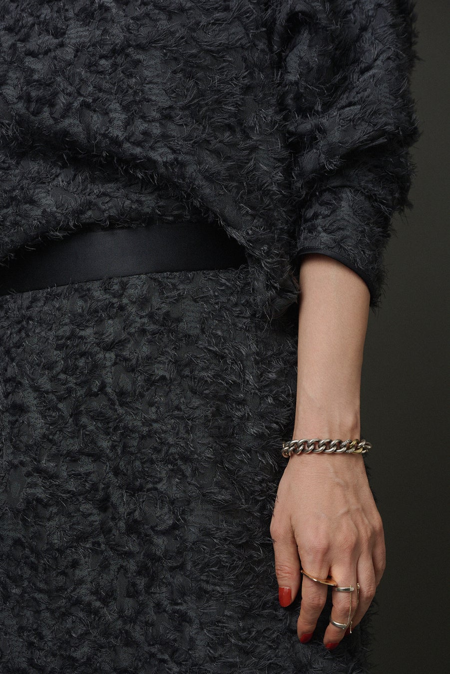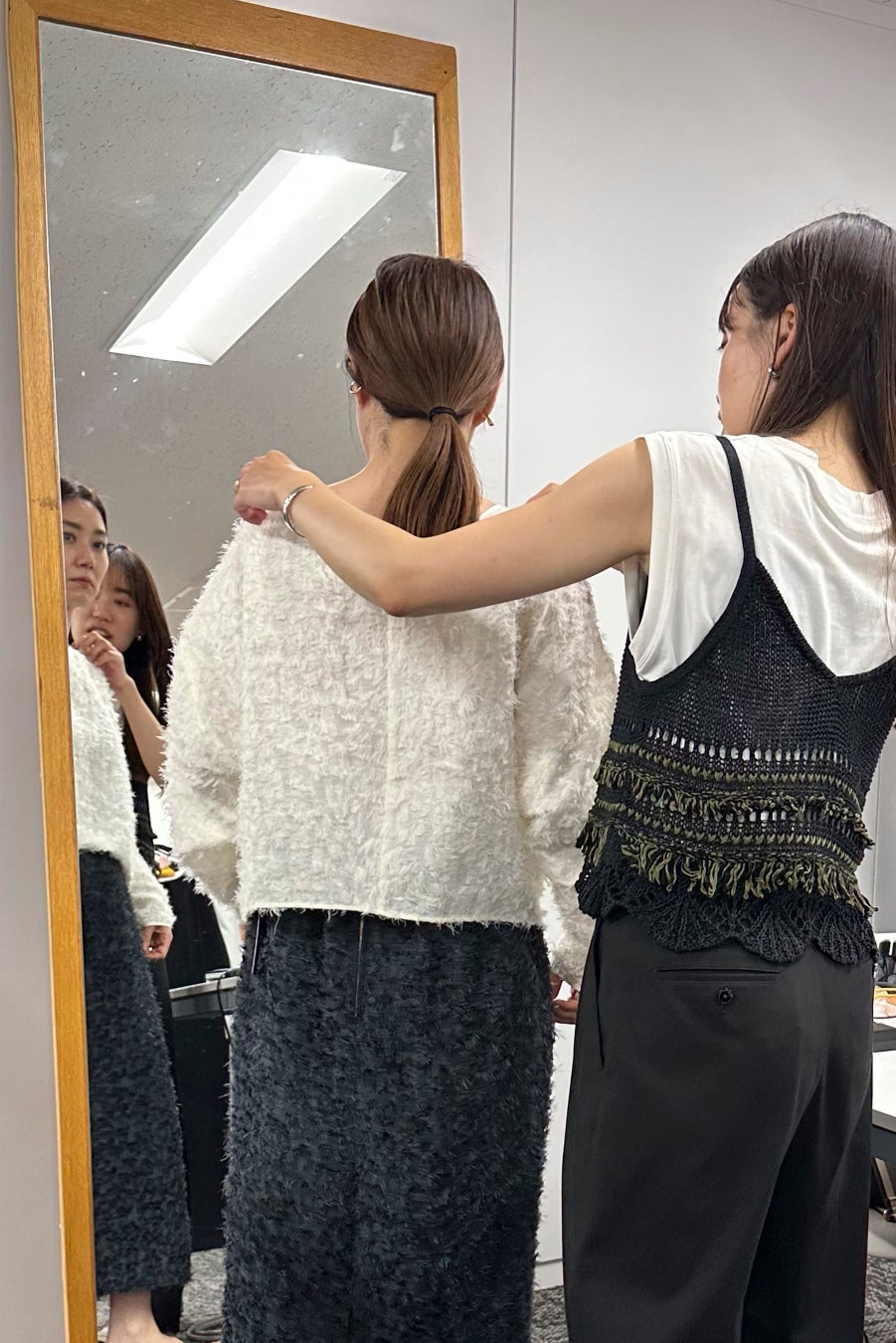ほのかに透け感があり、華やかなフェザージャガードを、カジュアルからフォーマルまでシーンレスに楽しめるブラウスです。妙子さんが特にこだわったのは襟元のデザイン。デコルテとバックスタイルが、一番きれいに見える絶妙なバランスを、何度も何度も試行錯誤しながら仕上げた究極の一枚です。