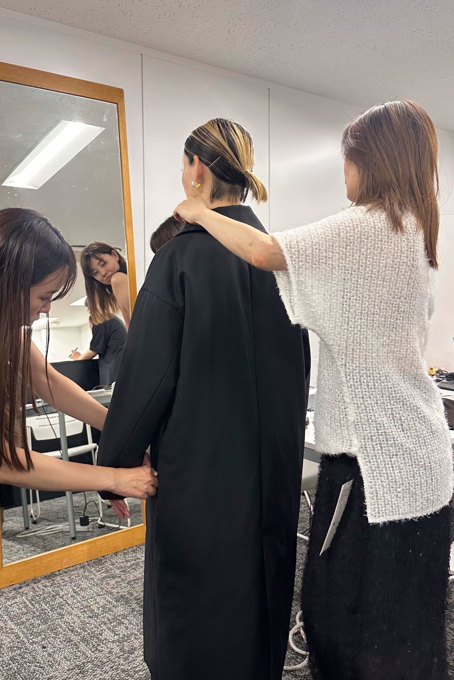 ふわりと抜け感のあるコクーンシルエットのオーバーコートはコーディネートを選ばない優れもの。7号と9号で着丈に7cm差をつけ、身長や体型 だけでなく、着こなしの雰囲気によっても選んで頂けます。後ろの裾センターにスリットが入っているので、ロングでも足さばきがよく、軽やかな印象で着こなせます。同じ身長でもきちんと着たいなら7号、ラフに着るなら9号を選ぶのがおすすめだそう。