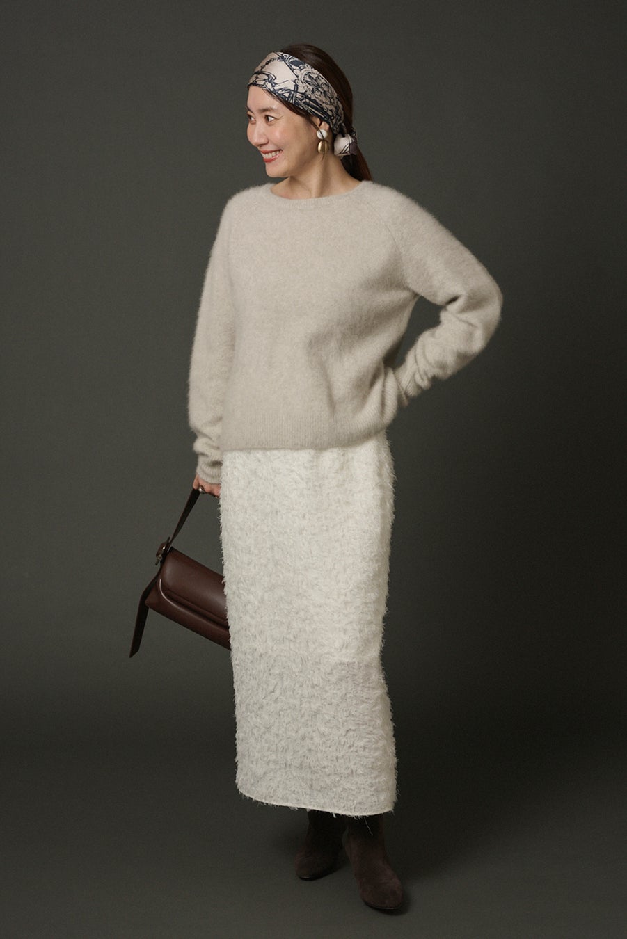 柔らかな印象のワントーンのスタイリング。フェザージャガードの華やかなタイトスカートには上質でシンプルなヘアリーなニットを合わせると、この上 なくリッチに。ブラウンの小物と、スカーフを合わせると、ぐっと今年らしい印象になります。