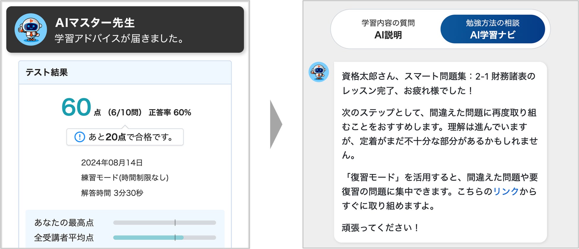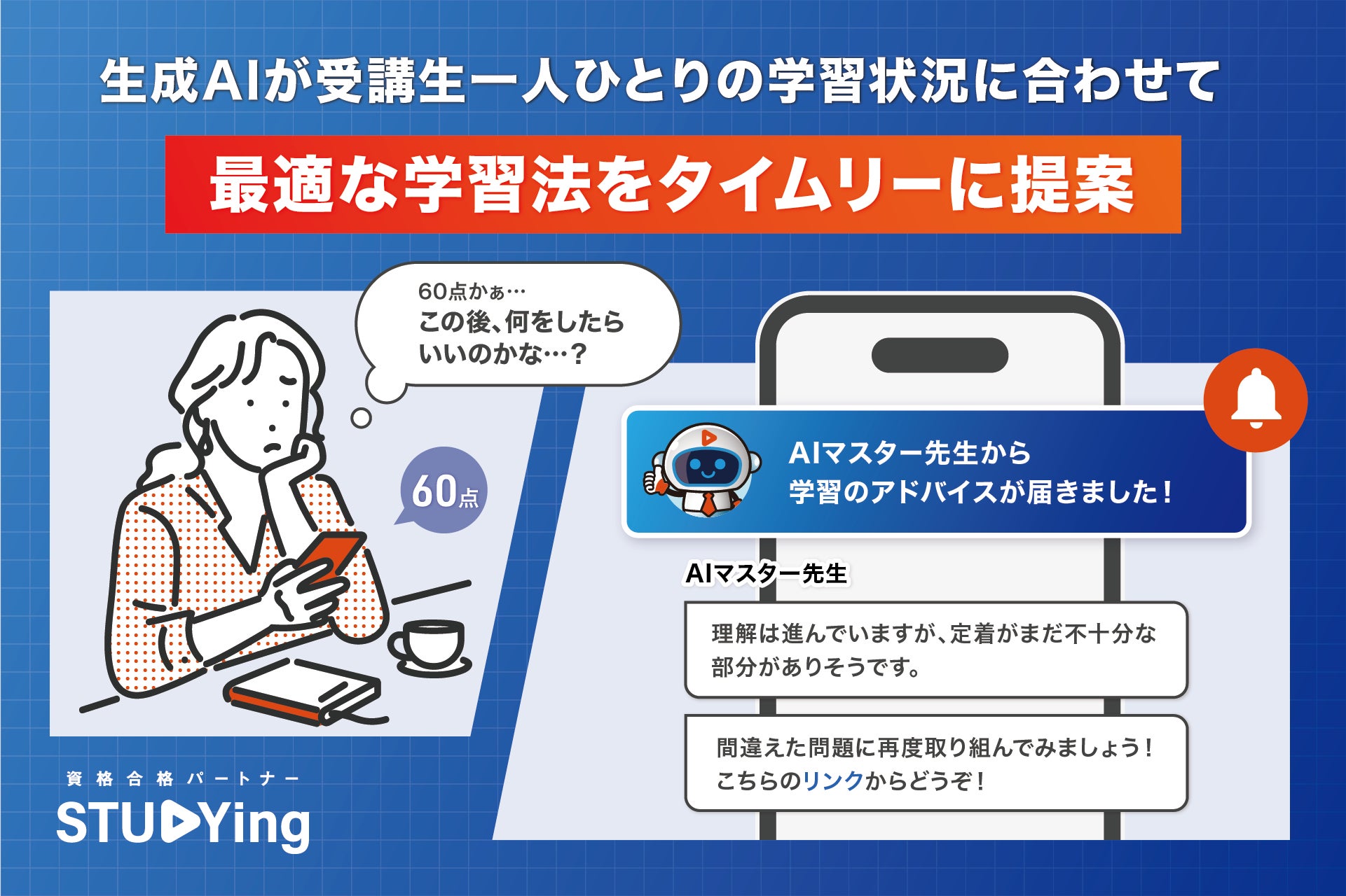 スタディングではこれまで、生成AIを利用した機能として、「AIマスター先生」が学習内容に関する質問に回答する「AI説明機能」や、受講生の答案を即時に添削する「AI添削機能」を提供しております。これらの学習内容についての個別指導に加えて、受講生一人ひとりの学習状況に合わせた学習法アドバイスを提供することで、受講生の”効率的な学習”を総合的かつ継続的にサポートしてまいります。
