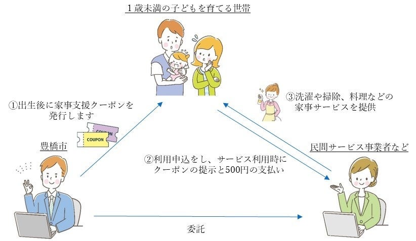その中で家事との両立も大きな負担になりやすいことから、1歳未満の子どもを育てる世帯に対して、家事支援サービスを1回500円で利用できるクーポンを配布します。