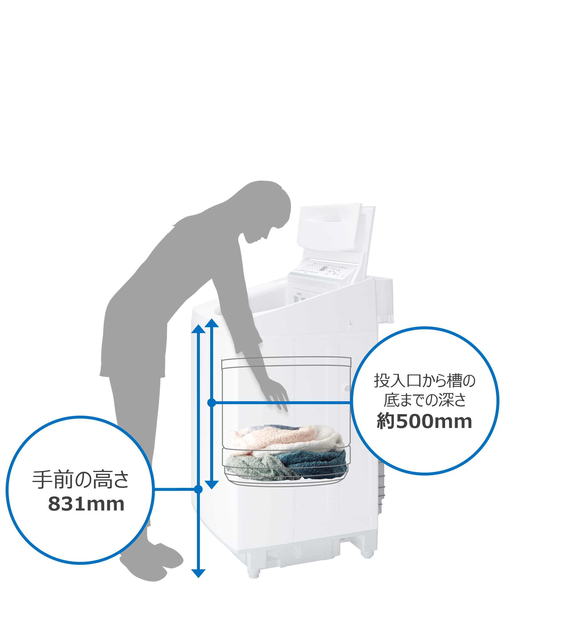 「ロー&ビッグ投入口」を初めて採用した2025年発売の12/10kgタイプでは、衣類の出し入れのしやすさなど使い勝手において市場で好評を博し、ユーザーの皆さまから多くの反響をいただきました。そこで今回9/8kgタイプ「AW-9DPB6」「AW-8DPB6」においても同様のデザインを採用。投入口の幅・奥行きをそれぞれ約5%拡大[※2]し、槽の底を浅くすることで衣類の出し入れのしやすさが向上しました。