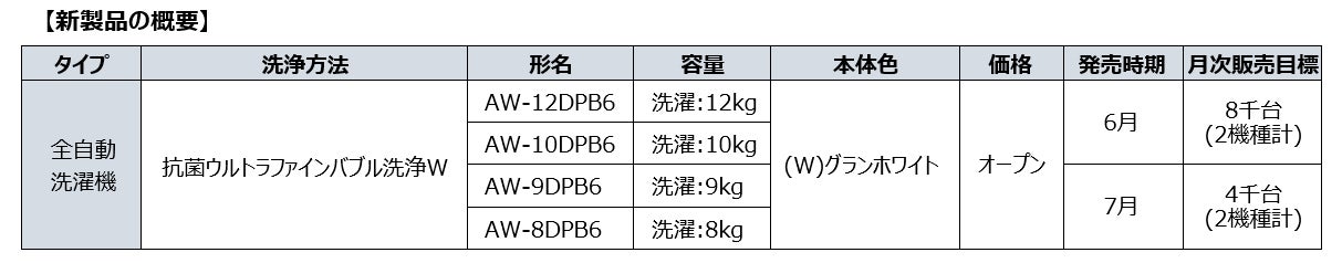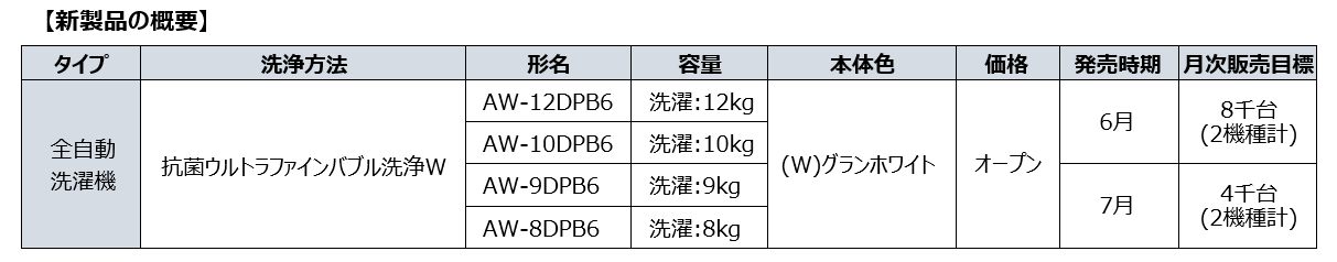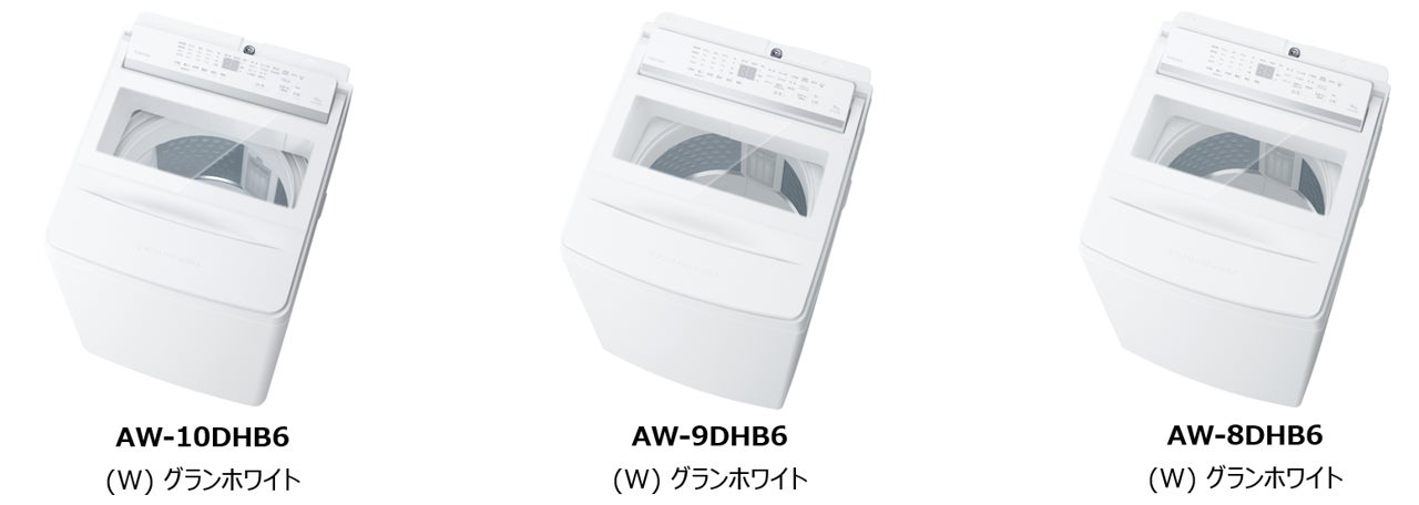 「ロー&ビッグ投入口」採用のエントリーモデルとなる全自動洗濯機「AW-10DHB6」を6月、「AW-9DHB6」「AW-8DHB6」を7月より発売します。「抗菌ウルトラファインバブル洗浄W」による洗浄力に加え、「クリアウィンドウ」や「バック操作パネル」の採用により使いやすさに配慮をしています。