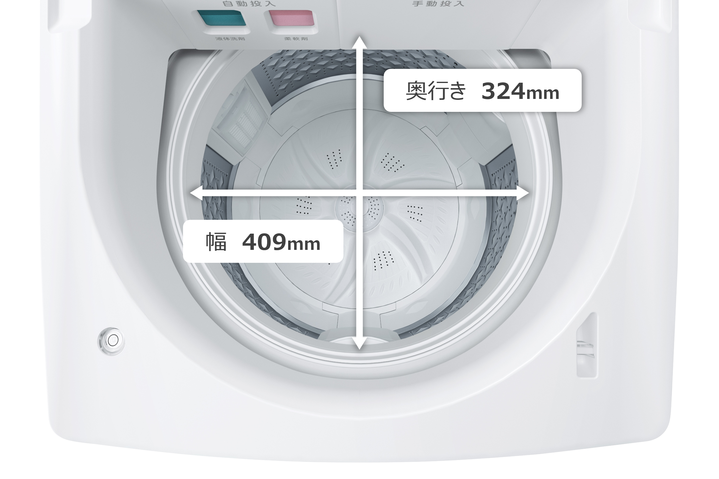 ※2 当社2025年機種AW-9DP5/8DP5(投入口の幅:388mm 奥行き:306mm)と2026年機種AW-9DPB6/8DPB6(投入口の幅:409mm 奥行き:324mm)との比較