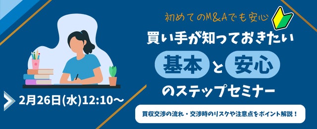 国内最大級のオンラインM&Aプラットフォーム「TRANBI」は、スモールM&Aに関心をお持ちの買い手様向けに、基本的な交渉の流れとトラブルやリスクを回避するための注意点を解説するオンラインセミナーを、2025年2月26日(水)12:10より開催いたします。