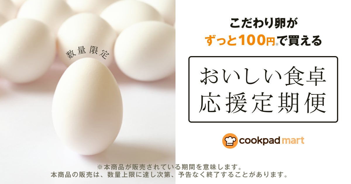 クックパッド株式会社が提供する生鮮食品EC「クックパッドマート」は、日常の食卓に欠かせない食材や食品を定期的に、低価格で届ける「おいしい食卓応援定期便」を開始しました。本施策の第一弾として、衛生管理や品質にこだわった茨城県産「都路(みやこじ)のたまご*1 」を、数量限定*2 で1パック(10個入り)100円*3 で定期販売しています。