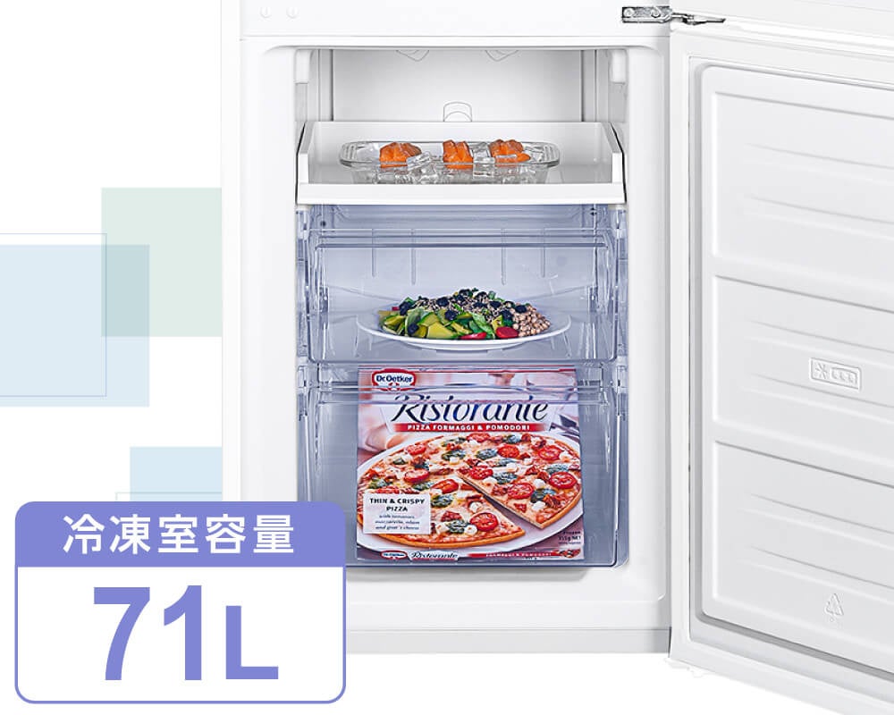 冷凍室は71Lのビッグサイズで、冷凍食品のピザやアイスの箱など、大きめの食品でもらくらく収納することができます。また、中段と下段に設置されている冷凍ケースは引き出し式で、冷気が漏れにくい設計となっております。