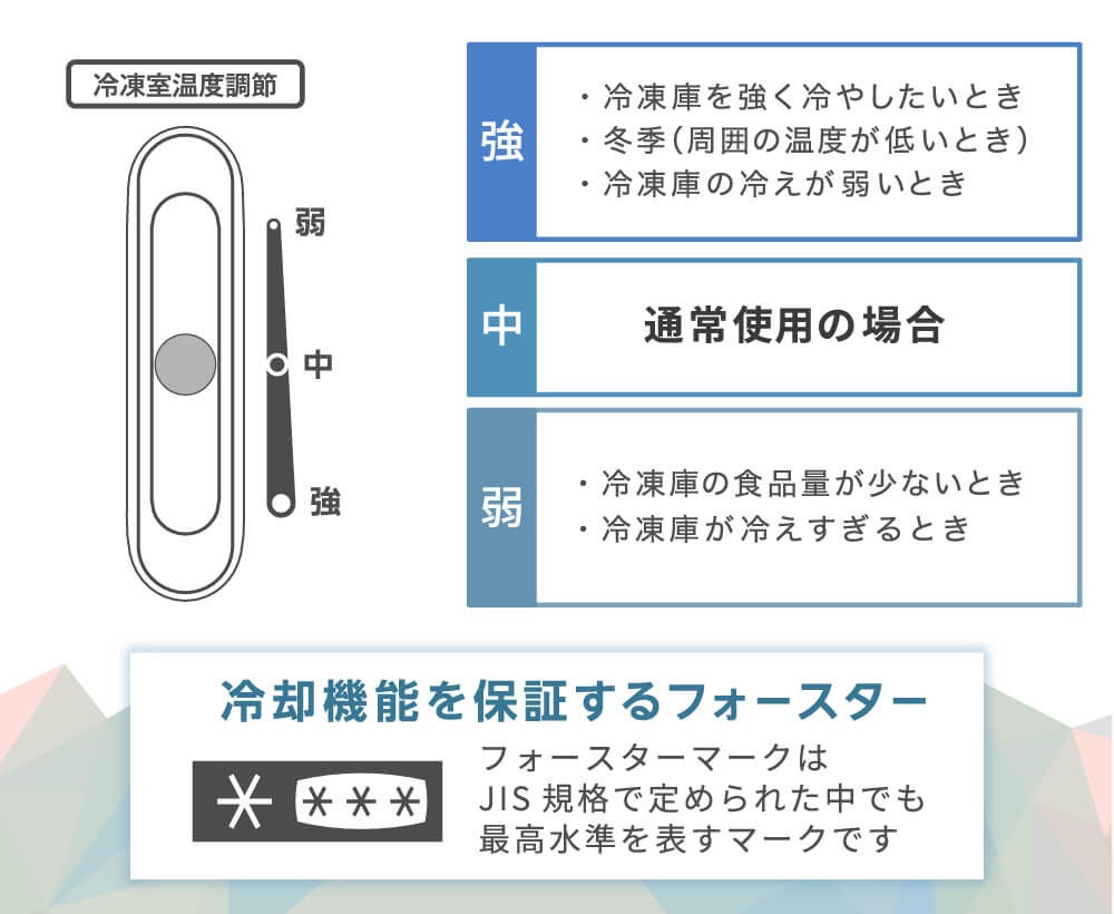 冷凍室と冷蔵室の冷気の配分は、弱・中・強の3段階に調節することができます。また、冷却機能については、JIS規格の中でも最高水準であるフォースターが付与されています。