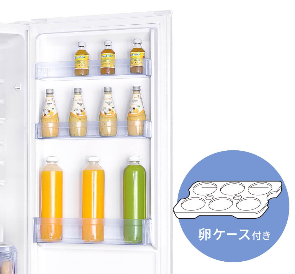 冷蔵室のドアポケットが設置されています。上段・中段には調味料などの小物を、下段には2Lのペットボトルや牛乳パック等の高さがある飲み物を収納でき、なおかつ簡単にサッと取り出すことができます。また、料理によく使う卵をすぐに取り出せる付属品の卵ケースは、ドアポケットにセット可能です。