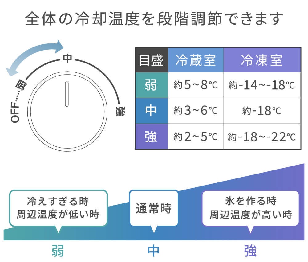 温度調整は、誰でも簡単に操作できるダイヤル式を採用しました。ダイヤルには弱・中・強の3段階の目盛があり、周辺温度が低いときや氷を作るとき等、冷蔵室と冷凍室の温度を状況に合わせて設定することができます。