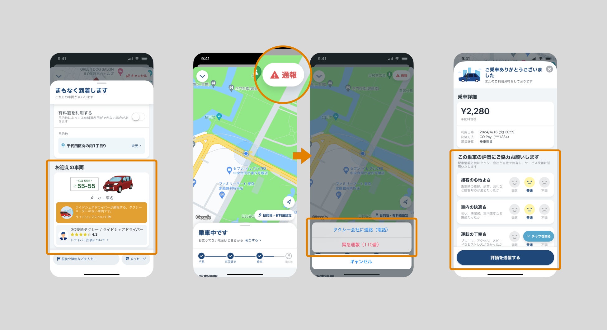 「日本型ライドシェア」車両への手配確定後、当該車両のライドシェアドライバーに対するこれまでのお客様による評価が表示 ※3 され、お客様は乗車前に確認することができます。併せて、到着通知画面には乗り間違い防止のために車種・車の色・ナンバープレートが表示されます。乗車中には、警察およびタクシー営業所への通報機能を提供します。乗車後には、タクシー同様にライドシェアドライバーに対する乗車後評価を付けられる画面が表示されます。また、ライドシェアドライバーが運行に用いるドライバーアプリにお客様に対する5段階評価を付けられる機能を試験的に実装し、お客様およびライドシェアドライバー双方にとってより安全・安心なサービス提供のための機能改善に活かしてまいります。