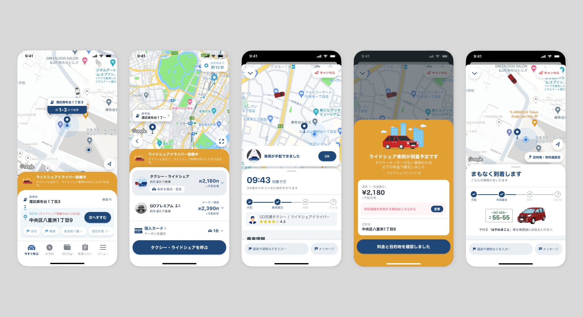 1.タクシーの配車(今すぐ呼ぶ/事前確定運賃/AI予約/複数台) 2.お支払い手段の事前登録による配車時及び車載タブレットでのGO Pay 3.電子領収書発行 ※一部機能は一部地域での提供 |