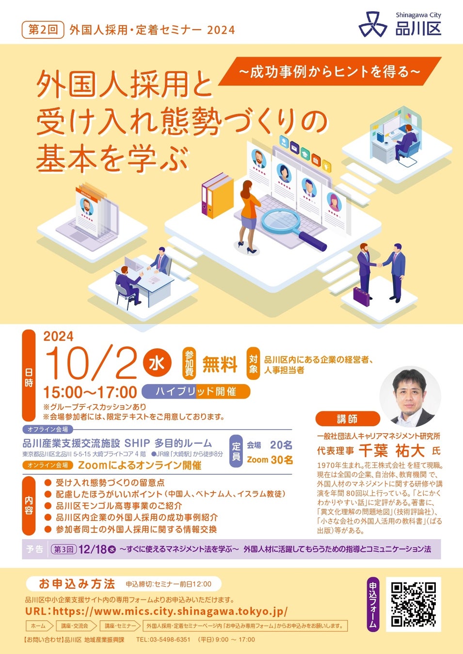 本セミナーは品川区内の中小企業を対象に毎回テーマを変え、外国人採用・受入れに関しての知識を習得するためのプログラムを提供します。