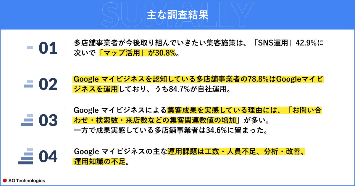 ソウルドアウト株式会社(本社:東京都文京区 代表取締役会長CGO:荻原 猛)の連結子会社であり、店舗事業者向けにGoogle ビジネスプロフィール(マイビジネス)を活用した集客支援サービス『ライクル GMB』を提供するSO Technologies株式会社(本社:東京都文京区、代表取締役:山家 秀一、以下 「SOT」)は、実店舗展開をする多店舗事業者向けに、集客とGoogle ビジネスプロフィールの取り組み状況について調査しました。