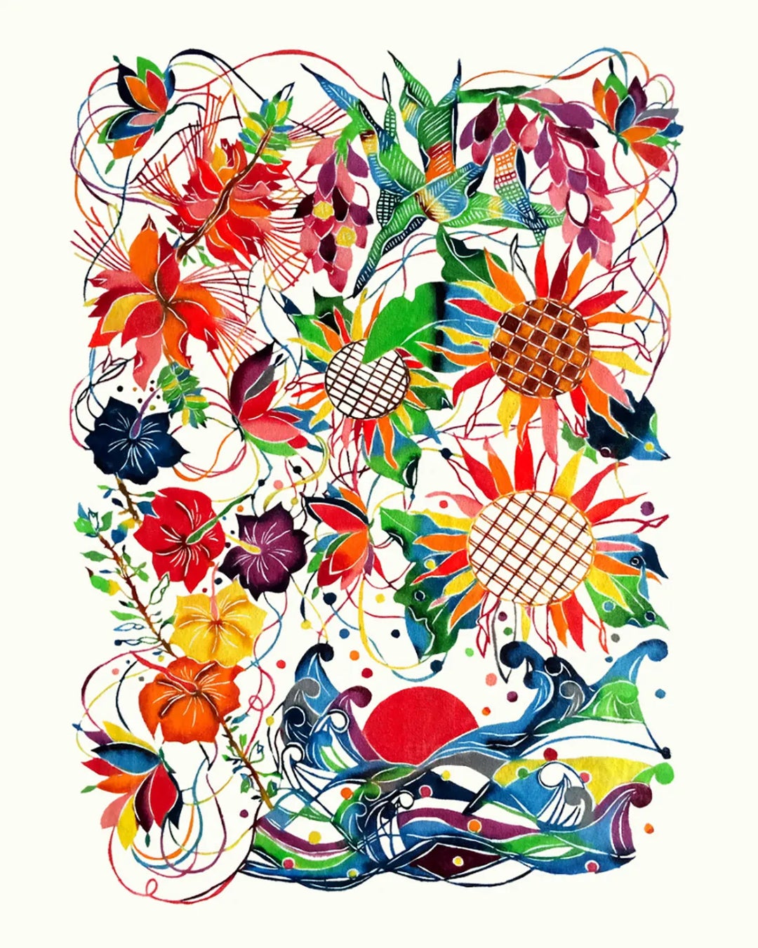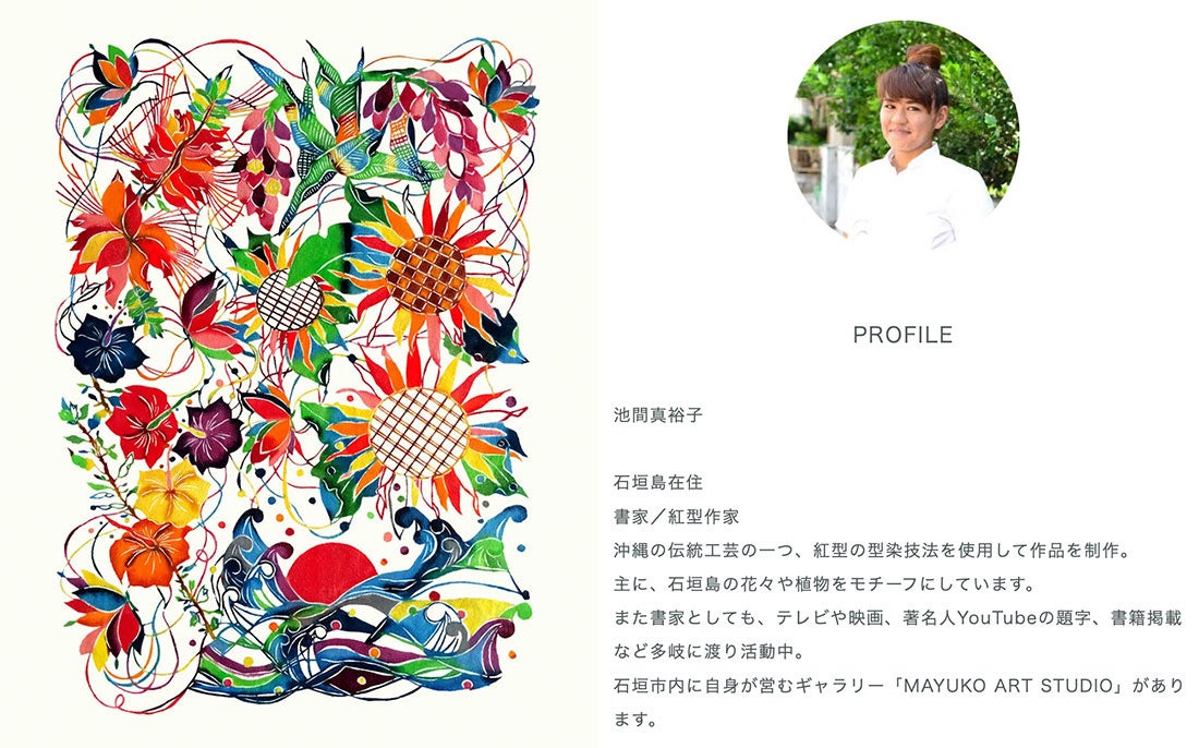島の花々の色をより引き立てる青い海と空、緑の木々や赤瓦、灰色のコンクリート。池間さんの作品は自然と島の色鮮やかな景色からインスパイアされています。