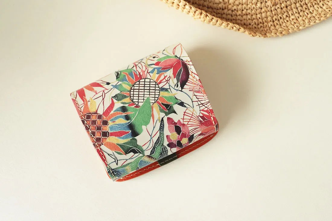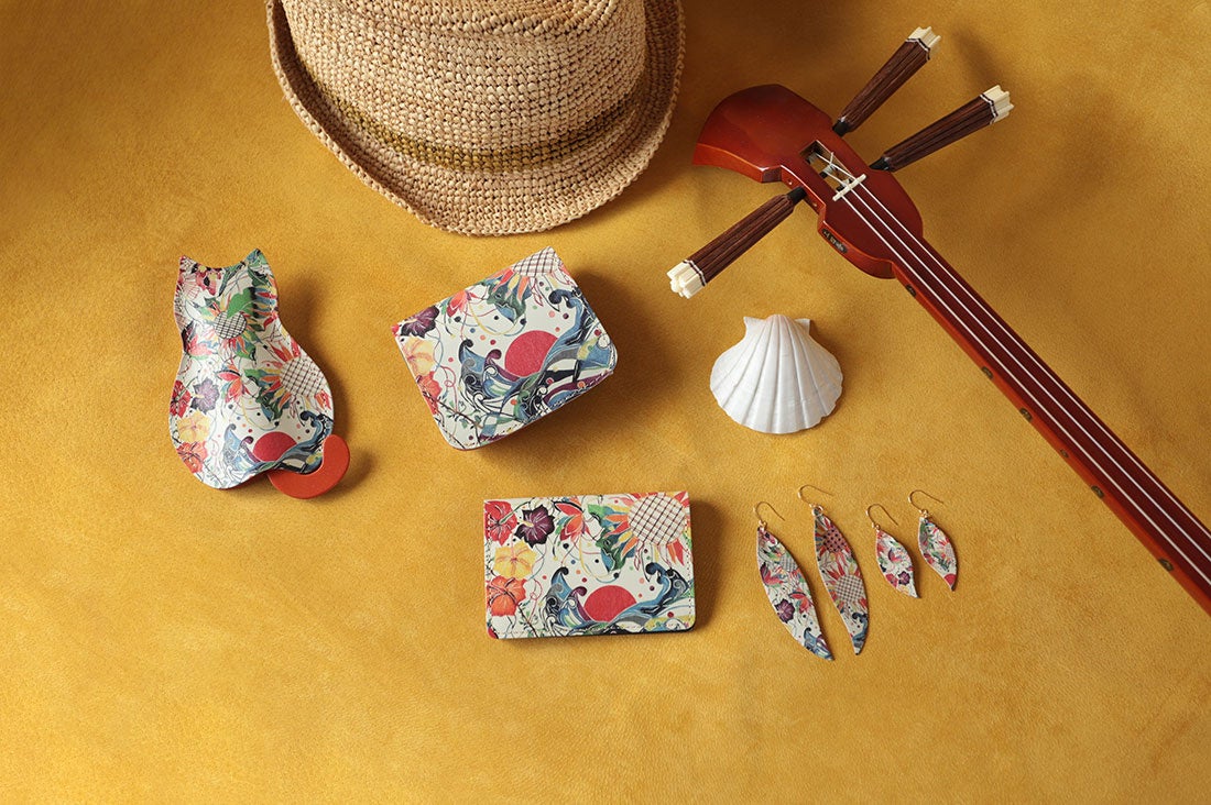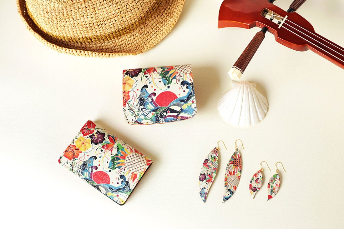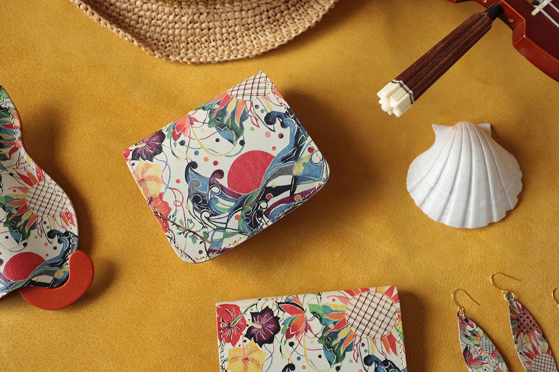 紅型作家・池間真裕子さんのアートと、小さいふ専門店の革職人のコラボ。