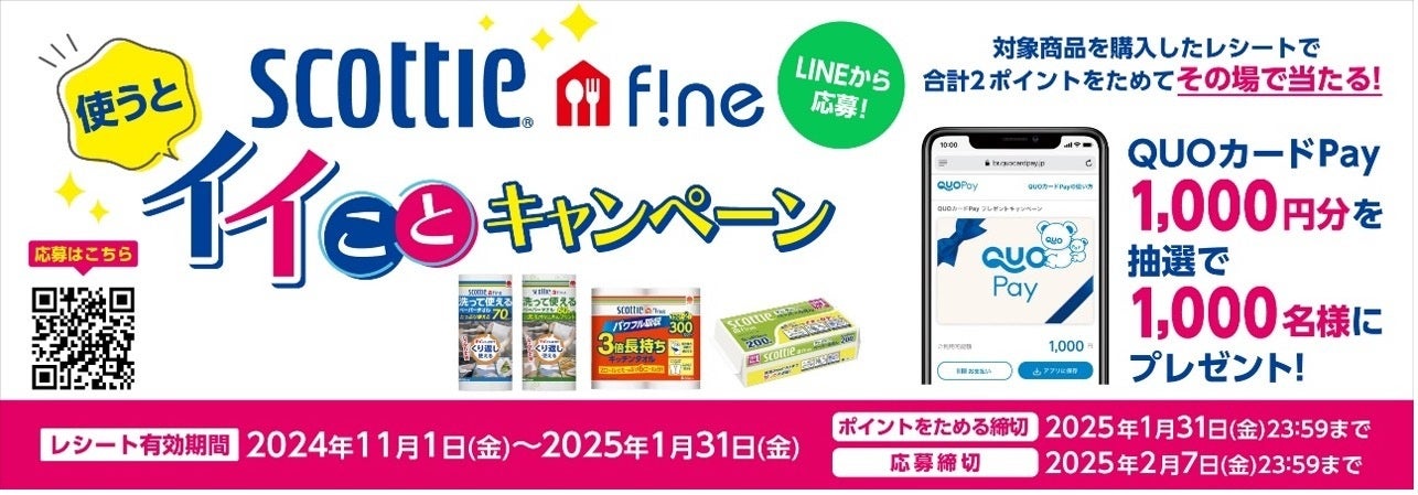 株式会社クオカード(以下当社、本社:東京都中央区、代表取締役社長:近田 剛)が展開するスマートフォンで使えるデジタルギフト『QUOカードPay(クオ・カード ペイ)』は、日本製紙クレシア株式会社が11月1日(金)より開催する「スコッティ ファイン 使うとイイことキャンペーン」で採用されました。本キャンペーンでは、期間中対象商品を購入したレシートで合計2ポイントをためてLINEで応募すると、抽選で1,000名様にQUOカードPay 1,000円分がその場で当たります。