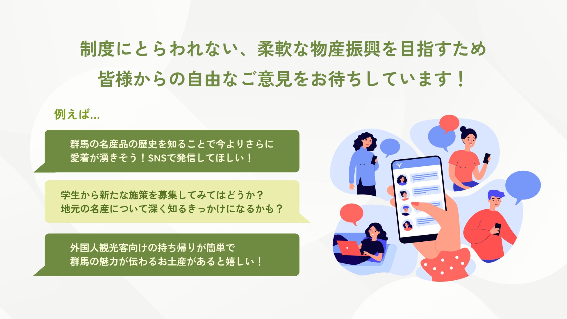 「群馬県自慢の名産品がさらに輝くには?あなたのアイデア募集します!」をテーマに、コメント募集