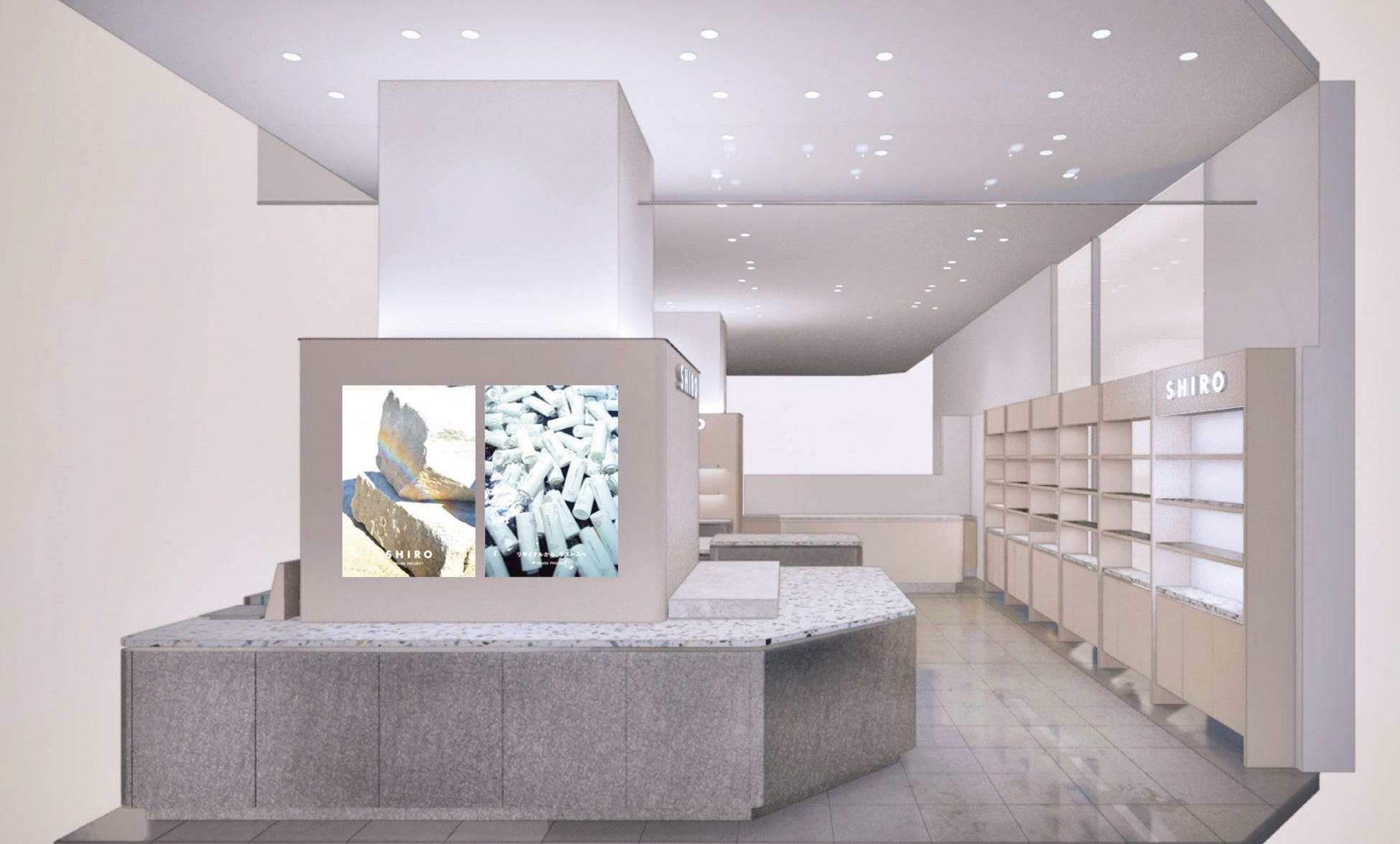 「SHIRO 岩田屋店」はこのたび、同エリアにて増床リニューアルオープンいたします。広くなる店内では、既存エリアで使用していた什器の配置をなるべく変えずに使用。什器平面の素材など、たくさんのお客様をお迎えしてきた岩田屋店の面影を受け継ぎながら、つくり変えたり、新しく加えるのではなく、塗装を剥がすという引き算の方法で店舗全体のカラーリングを変え、新しさを感じていただけるデザインに生まれ変わります。
