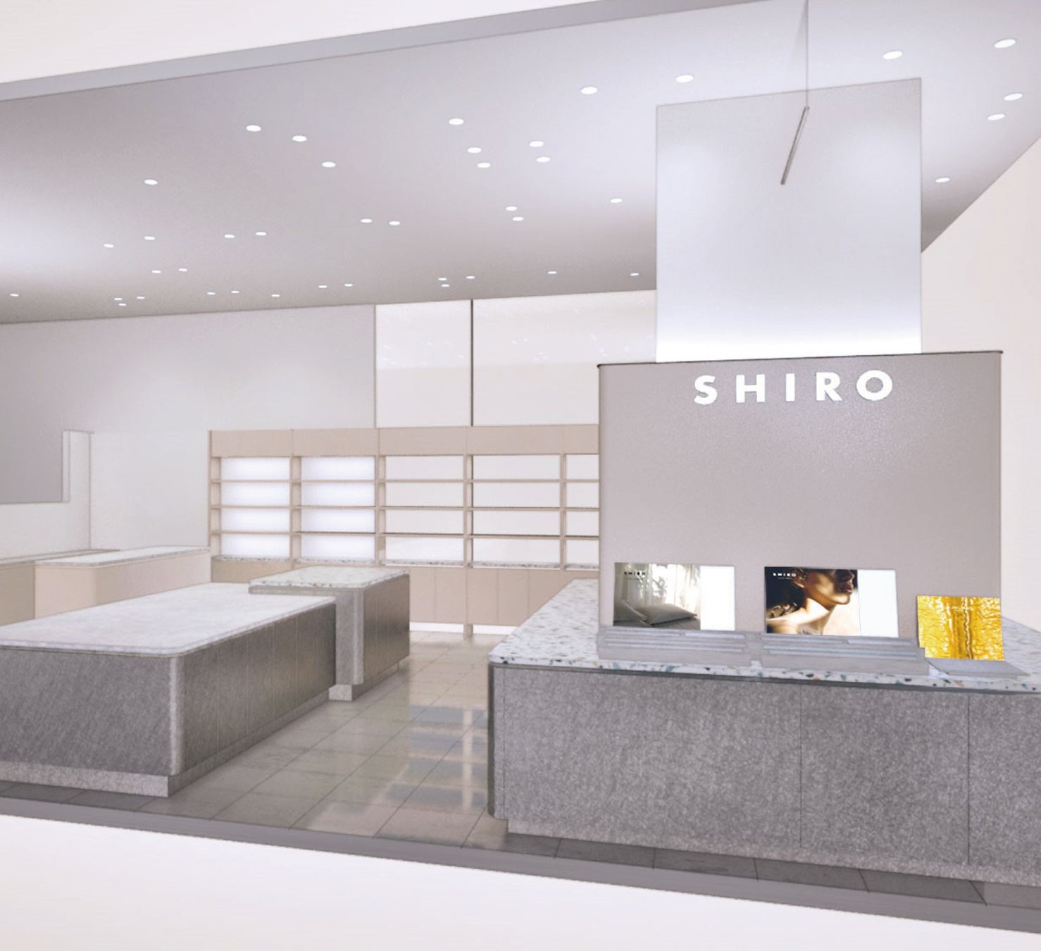 既存の什器は、リニューアル前のお店の面影を感じられるよう活かしています。増床にあたり新たな什器も設置しますが、元々使われていたものは配置もなるべく変えずに使用。新設する部分は、既存のテラゾータイルのベースカラーに合わせた研ぎ出しタイルを採用することで、空間になじませました。ぜひ実際にお越しいただき、かつての面影と新しさが共存する「SHIRO 岩田屋店」をご覧ください。皆様のご来店を、