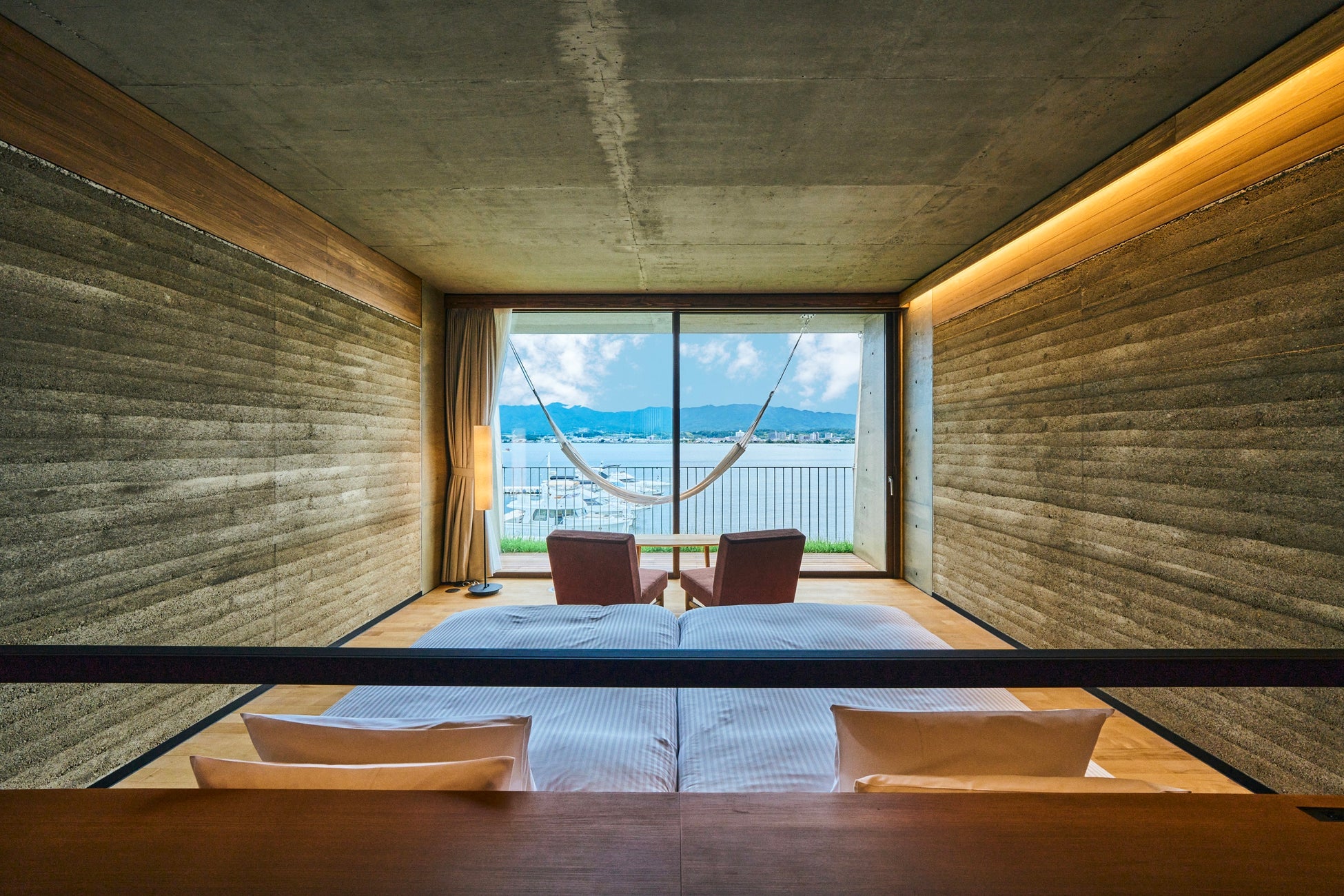 全室テラスとハンモック付きの客室は全5部屋あり、窓外の琵琶湖や比良山系を眺めることができます。またミニキッチンや和室も備えたスイートルームも2部屋用意しています。滞在中は、レストランやバーラウンジに加え、琵琶湖との一体感を楽しめるインフィニティプールや、水着のままととのえるサウナ・水風呂も自由に利用できます。