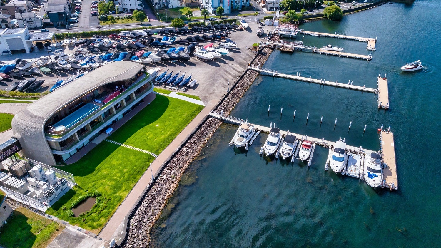滋賀県の木、土、葦などの自然素材を用いてつくり上げた曲面形状の屋根を持つクラブハウスです。木製建具を開くと琵琶湖からの風が通り抜け、建物に降り注ぐ雨水を用いてビオトープを育てるなど、光、水、風、音の自然現象を建築に取りこみ、滋賀の自然を楽しめる空間をつくりました。このクラブハウスは、地球環境と調和した建築、ランドスケープを数多く手掛ける建築家芦澤竜一氏が設計しました。マリーナでは、船を所有していなくても楽しめるマリンアクティビティやレンタルボートなども気軽に楽しむことができます。