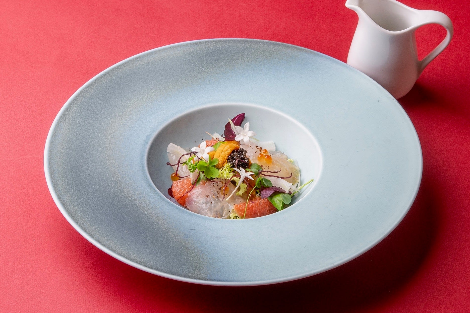 天然ヒラメのカルパッチョ アーモンドミルクと海の宝石を着飾って