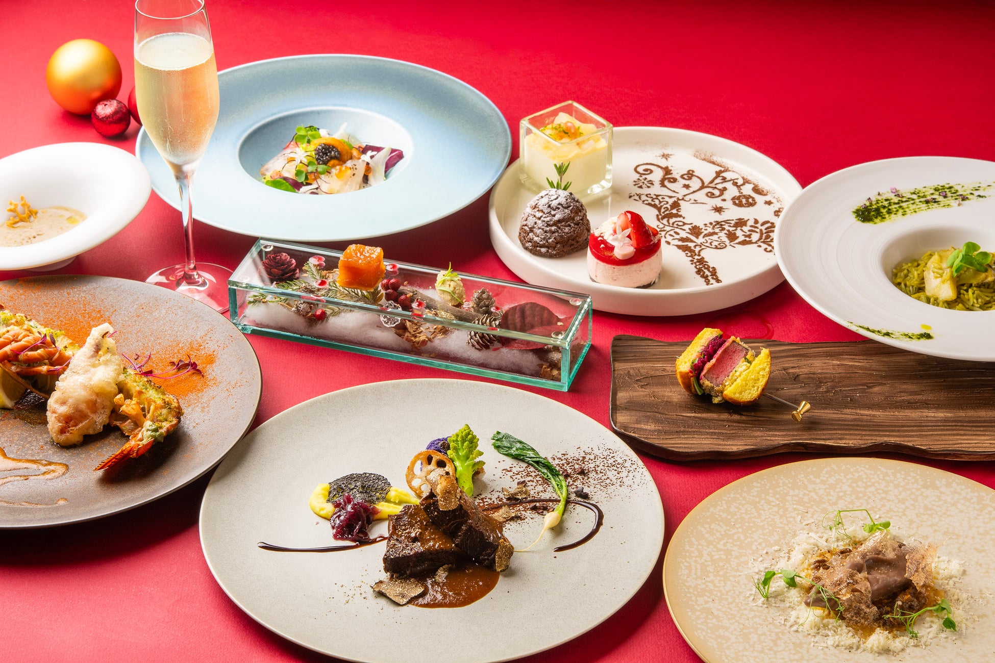 温かみのある店内は落ち着いた雰囲気で、大切な人とゆったりとした時間をお過ごしいただけます。お料理はクリスマスの大切な時間にふさわしい食材をシェフが厳選、華やかに盛り付けた全10品のフルコースでお届けします。食後には、お好みのデザートが選べる人気のドルチェワゴンをクリスマススペシャルバージョンでご提供いたします。
