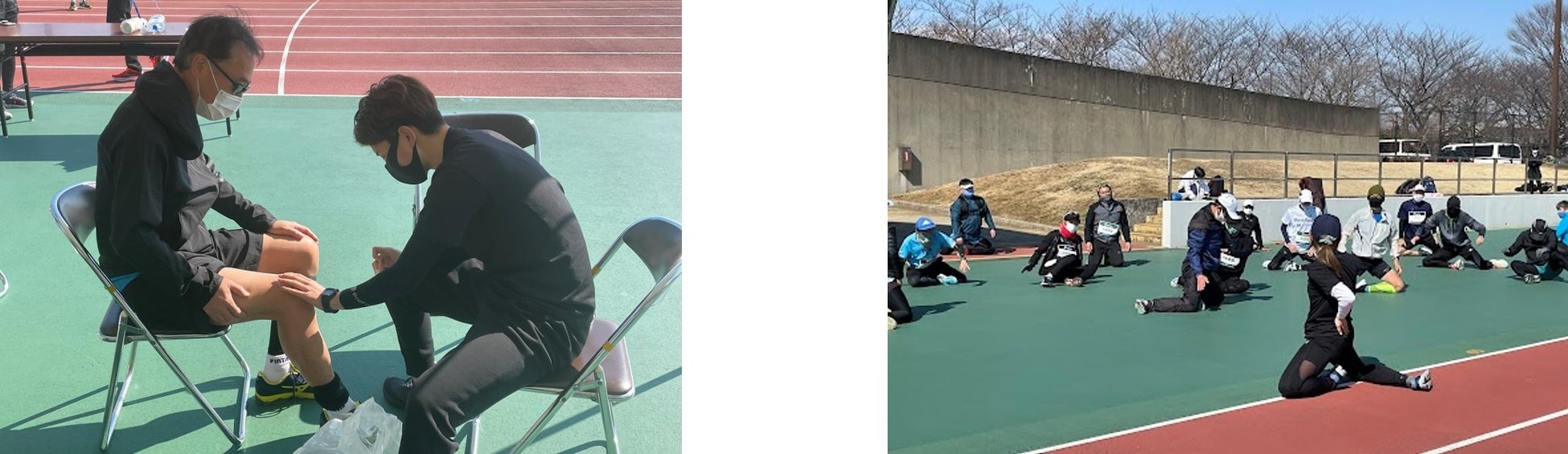 本大会ではランニングクリニックをレベルごとに3回実施しており、大会エントリー者はランニングクリニックに自由に何度でも参加することができます。各回のクリニックでは約30名ほどが参加し、マラソン時のフォームや靴紐の結び方など自分の走りをより良くするための講座を実施し、ランナーのモチベーション向上にもつながりました。 またテーピングを体験できるブースでは、プロ・フィッツのテーピングインストラクターが実際にランナーにテーピングを施すなど、大会前のコンディションを整える場となりました。