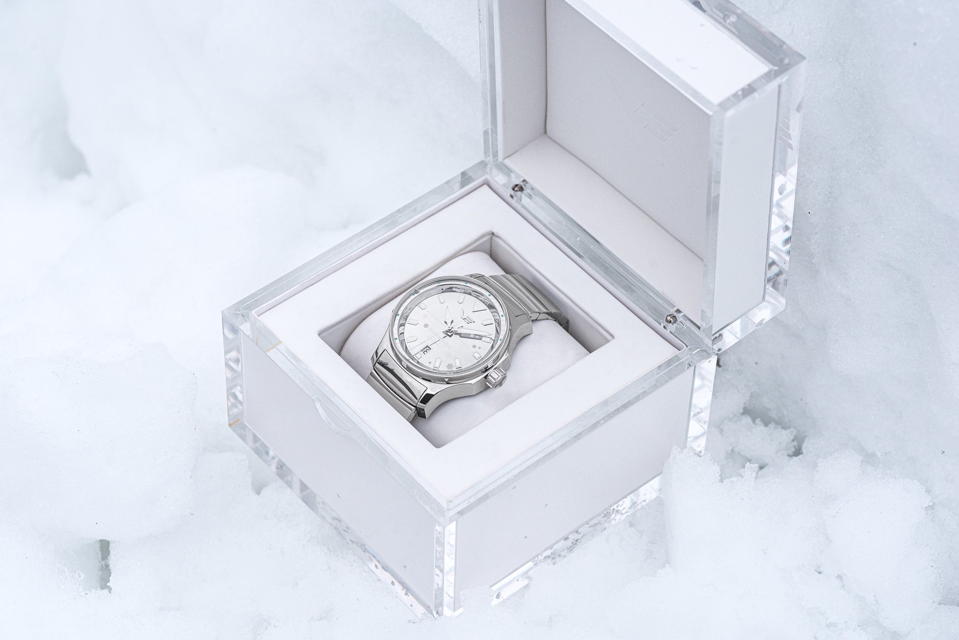 全身鏡面仕上げで朝焼けの氷河のような輝き。まるで極地の氷河が朝日を浴びて輝くような透明感と存在感20気圧防水&自動巻ムーブメントで極地にも対応。特製アクリルBOX付きでプレゼントにも最適