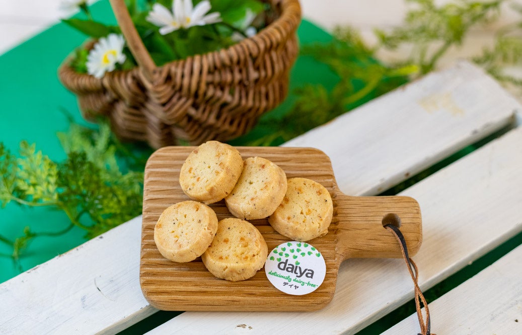 卵や乳製品などの動物性食品不使用のモッツァレラタイプのデイヤを使用し、ブラックペッパーがアクセントに効いたコクと旨味が感じられる一品。お酒との相性もよいおつまみクッキーです。