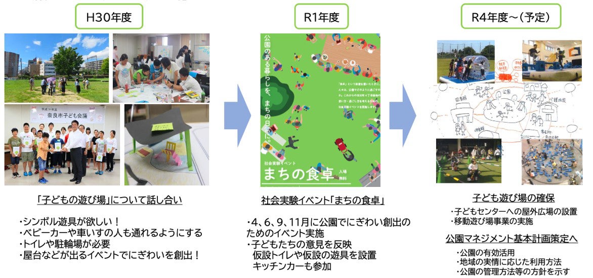 2018(平成30)年度には、「子どもの遊び場」について話し合いをし、その結果を基に、社会実験イベント「まちの食卓」が実施されるとともに、令和4年度以降の「子どもセンターへの屋外広場の設置」や「移動あそび場事業」といった施策につながっています。今後も、子どもの意見を取り入れながら、子どもがのびのびと利用できる遊び場や公園の在り方について検討していきます。