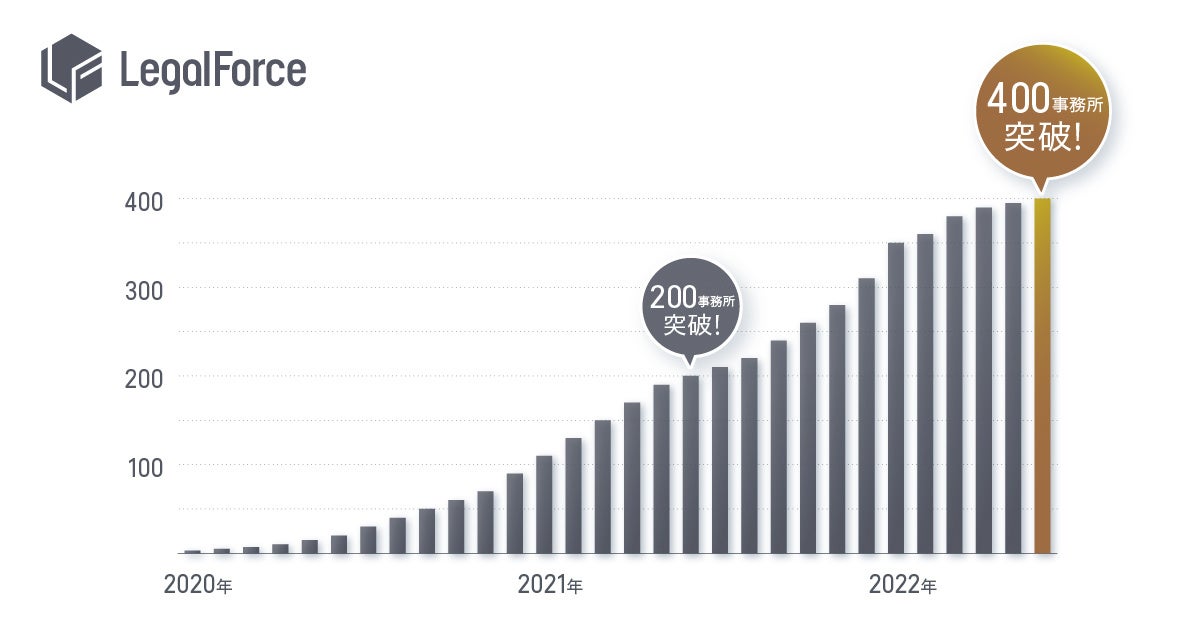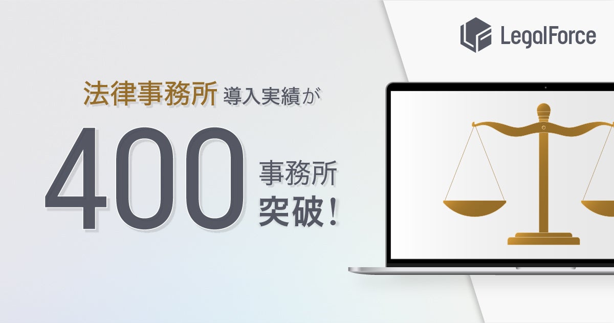 株式会社LegalForce(本社:東京都江東区 代表取締役社長:角田望、以下LegalForce)は、提供するAI契約審査プラットフォーム「LegalForce」の法律事務所への有償導入数が、400事務所を突破したことをご報告いたします。