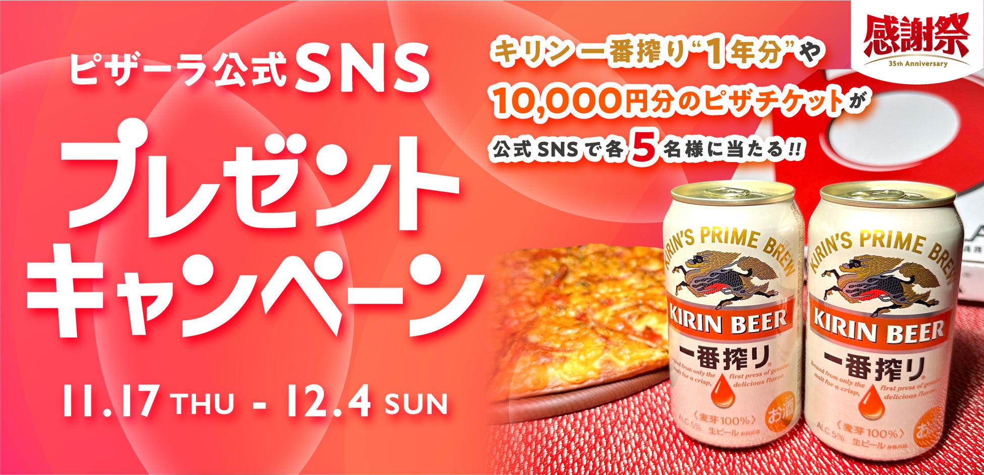 株式会社フォーシーズ(本社:東京都港区南青山 代表取締役社長:淺野幸子)が展開する宅配ピザ「PIZZA-LA」は、【ピザーラ感謝祭】SNSプレゼントキャンペーンとして、Twitter ・ Instagram ・ TikTokのピザーラ公式アカウントにて合計15名様に、キリン一番搾り“1年分*”や、ピザーラのピザチケットが当たるプレゼントキャンペーンを2022年11月17日(木)から実施いたします。*1年分(350ml×24缶×11ケース)