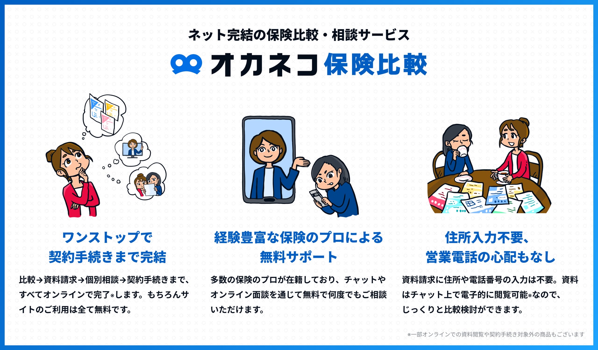 『オカネコ保険比較』は、ご自身のニーズや価値観にあった保険の選択を、ネット完結で分かりやすく簡単にできるサービスです。ユーザー数120万人(※1)を突破するオンライン家計診断・相談サービス『オカネコ』を運営してきた当社のこれまで蓄積してきたオンラインによるサポート体制やデジタル技術、ノウハウを活かし、どこよりも簡単で分かりやすいネット完結サービスを提供いたします。