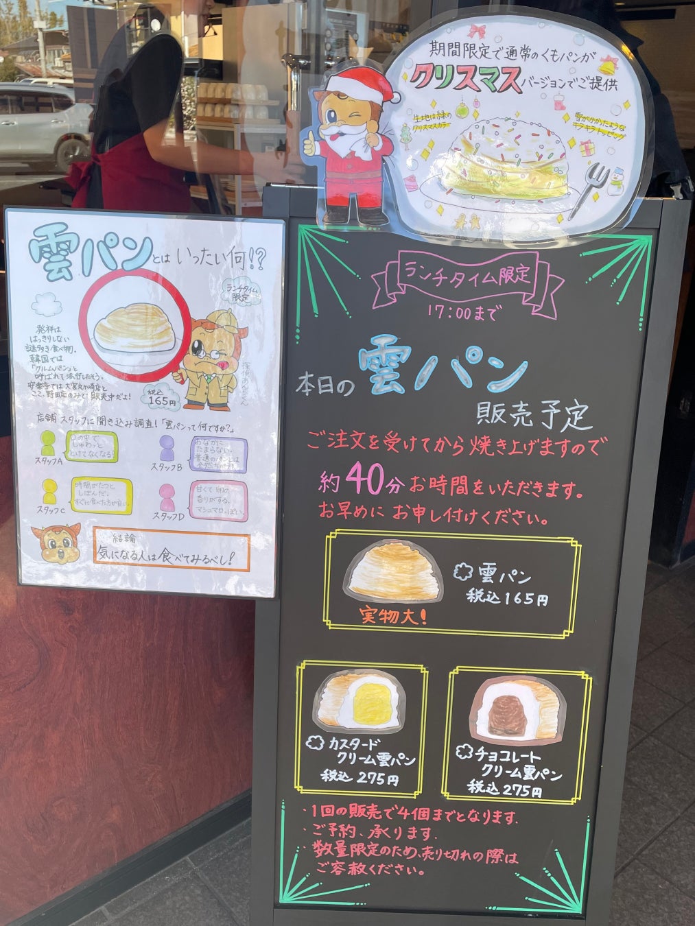 ご注文を受けてから焼き上げる出来立ての「雲パン」。お口の中でふわっととける不思議な食べ物!?カスタードクリームやチョコレートクリーム、クリスマスバージョンのキラキラトッピングまで、バリエーションも豊かで全種類食べたくなってしまいます!スタッフのオリジナリティ溢れる店内でぜひお楽しみください。