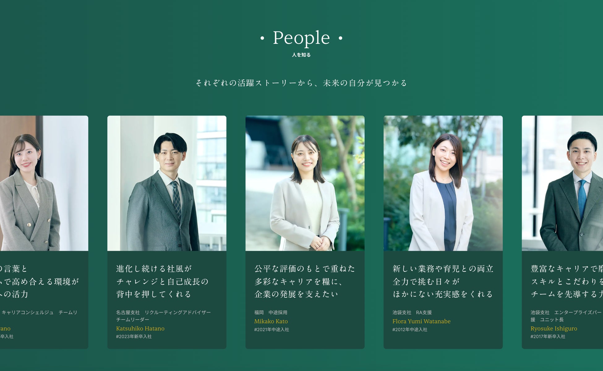 ワークポートでの多様なキャリアや働き方を具体的にイメージしていただけるよう、全国で活躍している社員のインタビューを掲載しました。新卒入社・中途入社といった垣根のない個性豊かなメンバーの声を掲載することで、より包括的にワークポートの魅力や働くイメージが伝わるようにしました。