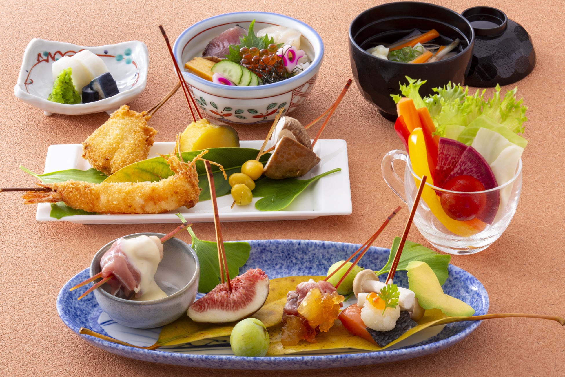 メインの串あげに、「岩手のりんごと豚肩ロース」「南部どりチーズフォンデュ」など岩手県食材を用いたアレンジ串が登場。イチジク、栗、焼き芋など秋らしい串とともに豊かな味で魅了します。鰹・帆立・いくら入りの海鮮丼や郷土料理「ひっつみ汁」も脇を固めるバラエティに富んだランチで愉しいひとときを!