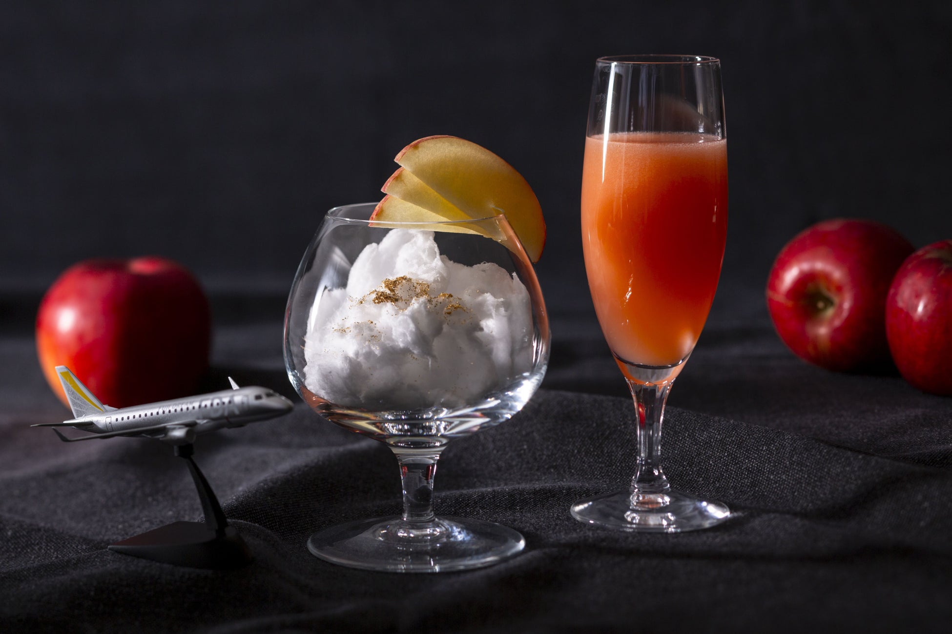 青森県産のりんごとアップルブランデーを使用した、“ 秋空”がイメージのカクテル。雲に見立てたコットンキャンディー入りのグラスにはりんごの羽根が飾られ、そこに夕焼け色のカクテルを注いで変化を愉しむ趣向に。アップルブランデーは「ラブヴァドス」と「クレイジーデイズ」の2種をご用意。