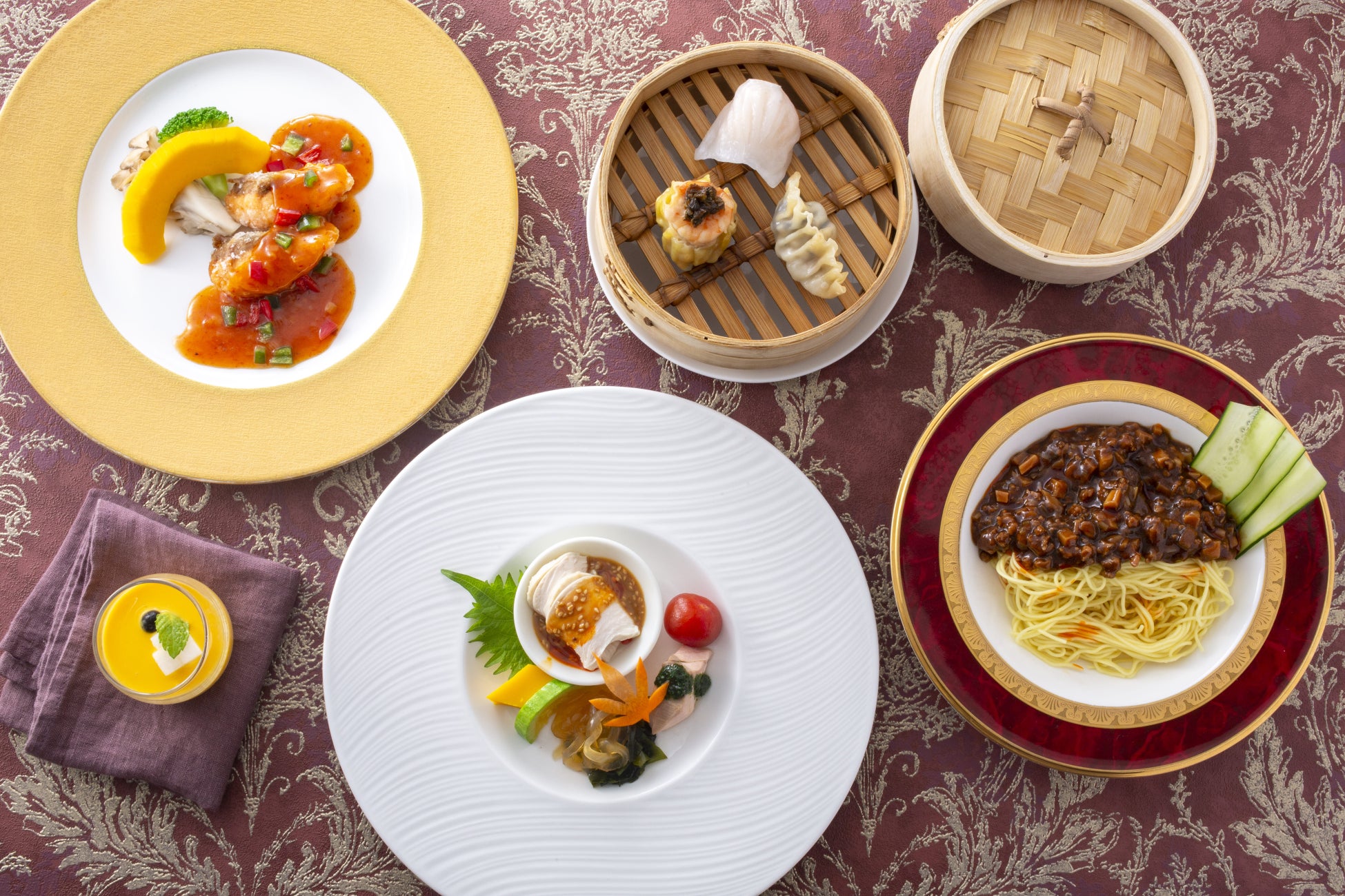 岩手県産の山海の幸を使用した中華前菜に始まり、コースの随所に魅力的な岩手県食材を散りばめたランチコース。蒸し点心は、焼売にはピリ辛の「ほろほろ漬け」をアクセントに利かせ、ふかひれ餃子には岩手県産の鮭を加えてより風味豊かに。またジャージャー麺は、岩手が誇るブランド肉・白金豚(プラチナポーク)を使用したコク深い味わいでお届けします。