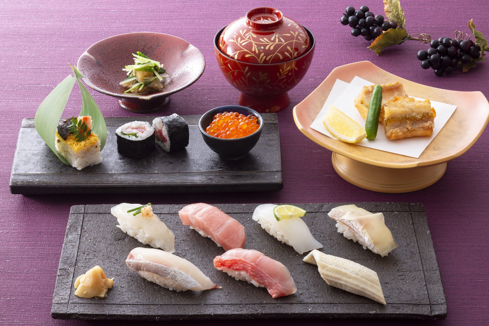 長野県のハレの日の郷土食「笹寿司」は、すし萬らしく押し寿司に錦糸玉子や海老をのせて“ ちらし風”にアレンジ。海鮮巻やいくらミニ丼、とろや金目鯛などの握りと併せて充実のラインナップでお届けします。そのほか上品で香ばしい甘鯛の唐揚げや季節の小鉢、デザートも付いた華やかなコースをご堪能ください。