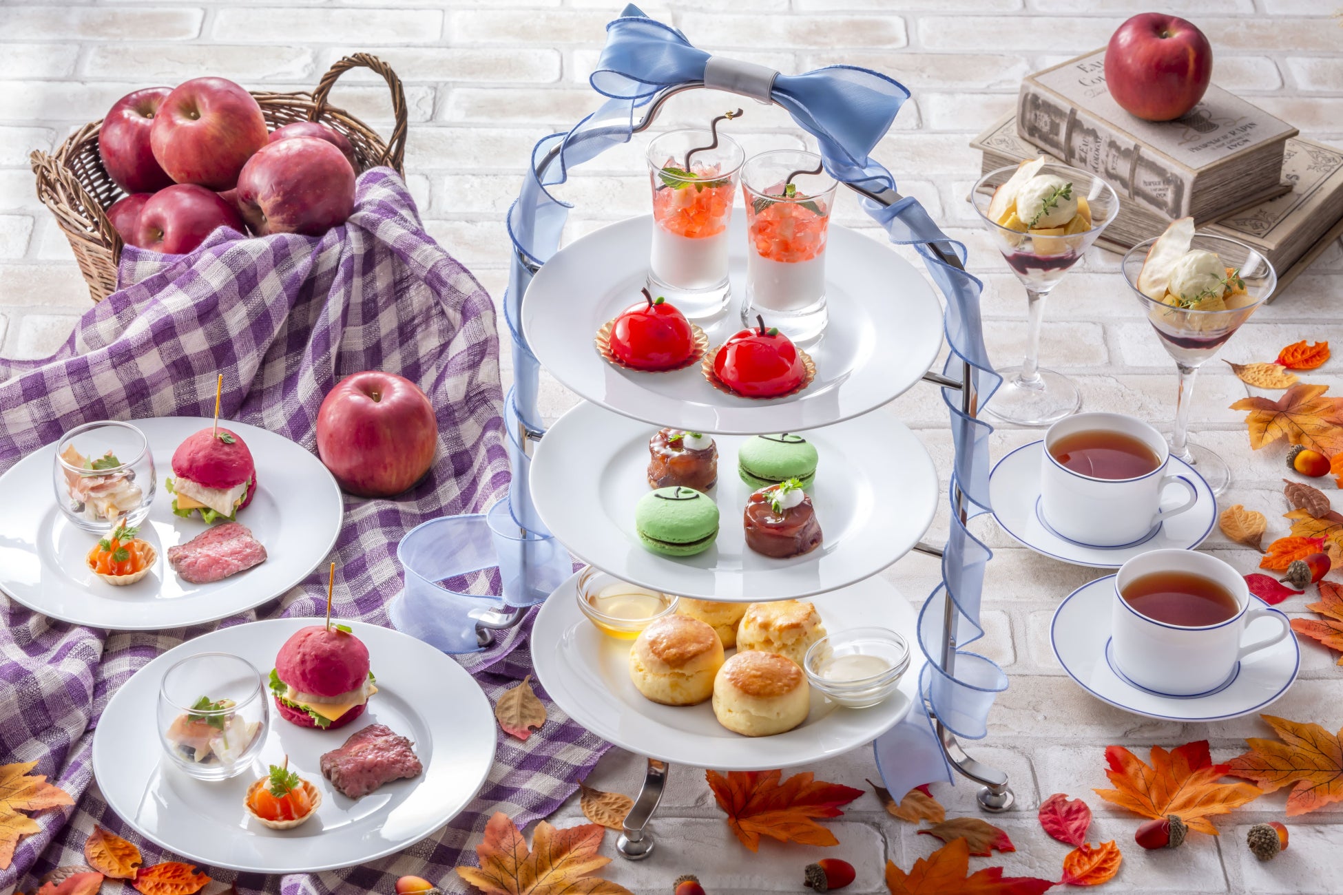 スイーツは、青森県産りんごの豊かな味わいを凝縮したタルトタタンやふんわり食感のムース、りんご酒シードルを使ったグラススイーツ、青りんごを象った塩キャラメルのマカロンなど多彩な味がラインナップ。青森県産サーモンや信州プレミアム牛などご当地食材のセイボリーとともにお愉しみください。