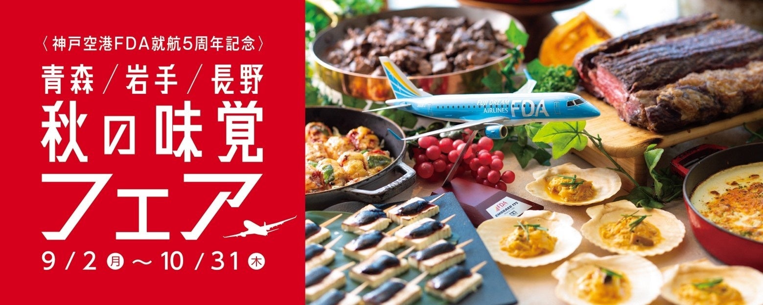 株式会社神戸ポートピアホテル(神戸市中央区、総支配人 伊藤 剛)では、2024年9月2日(月)~10月31日(木)の期間、館内レストラン10店舗にて『〈神戸空港FDA就航5周年記念〉青森/岩手/長野 秋の味覚フェア』を開催いたします。「食欲の秋」であるこの時期に、FDAが神戸空港から毎日直行便を運航している、青森(青森空港)、岩手(いわて花巻空港)、長野(信州まつもと空港)の豊かな自然に恵まれた食材を使った逸品を神戸ポートピアホテルの各店舗で提供いたします。この機会にぜひホテルを訪れたお客さまにご賞味いただき、各地へ思いを馳せ、FDAを利用して現地へ直接足を運び、食や観光をお楽しみいただきたいとの思いを込めたフェアです。また、2つの店舗を巡って素敵な賞品が当たる「青森/岩手/長野 秋の味覚フェア」スタンプラリーも開催いたします。