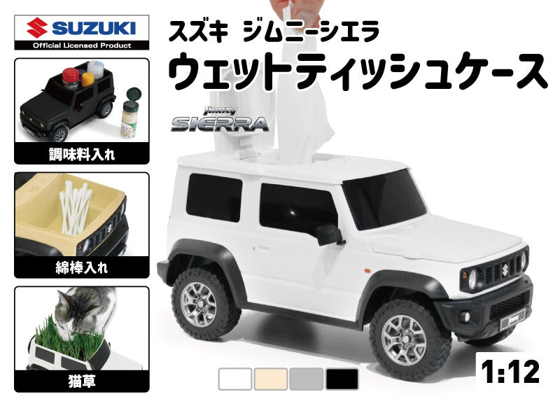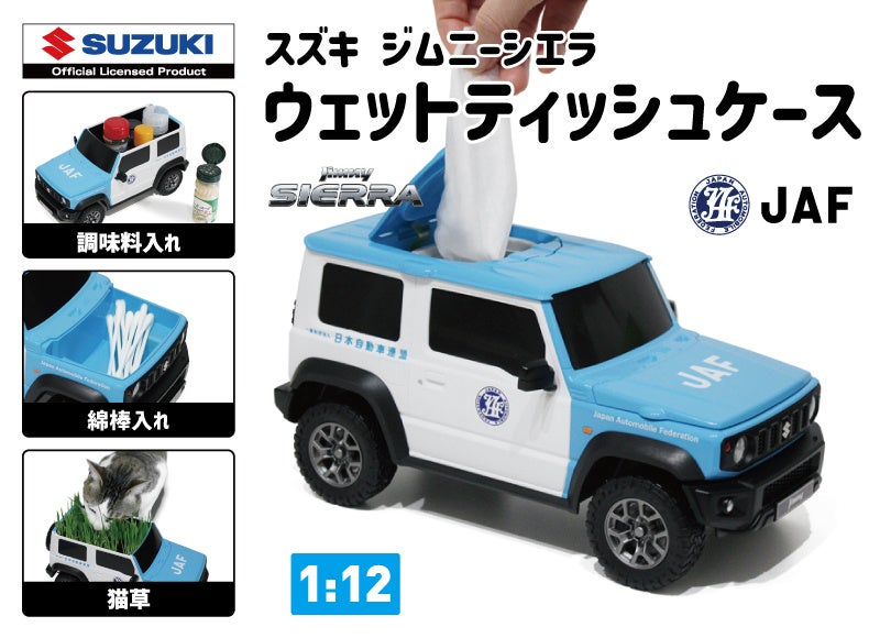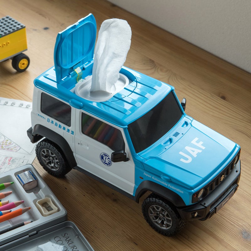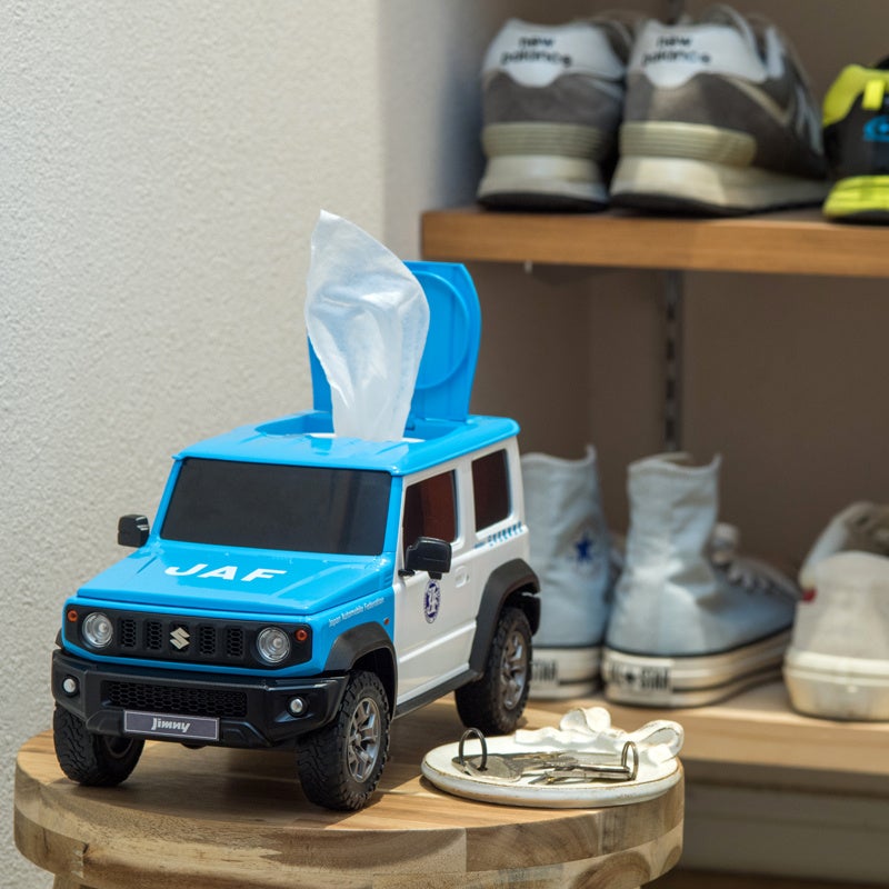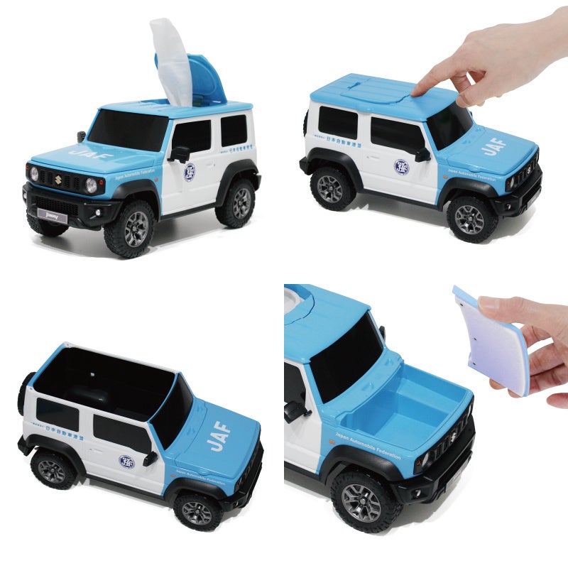 クルマのカタチの雑貨を企画販売する株式会社フェイスから、JAFの車両(スズキ ジムニー シエラ)のウェットティッシュケースが1000個限定で発売されました。