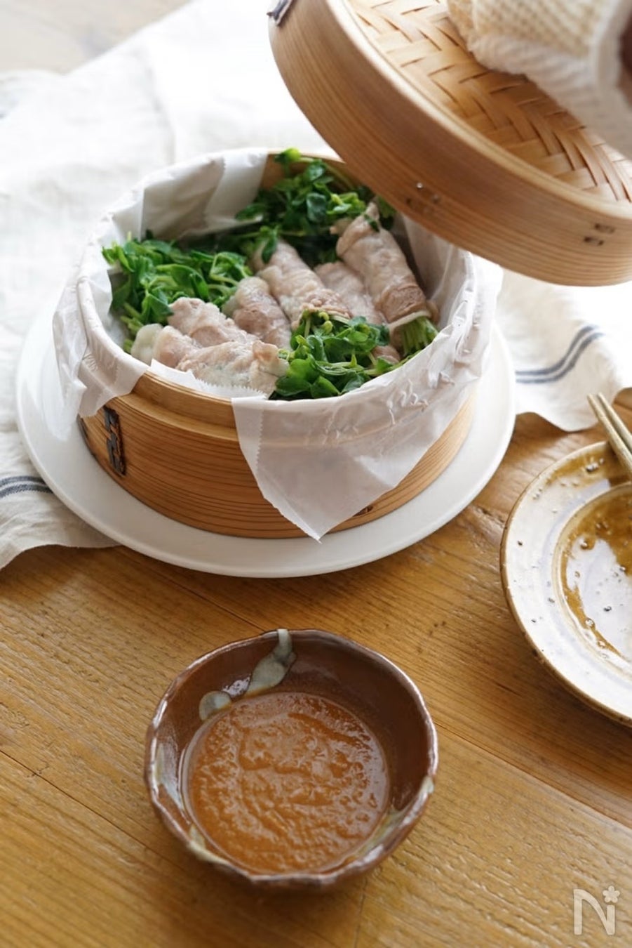 せいろで作る豆苗の豚巻きは、忙しい日でもさっと作れて、心と体を満たしてくれる絶品おかず。コク深い「ごま味噌ソース」につけて食べれば、野菜もお肉もたっぷり食べられます。同時にきのこなども一緒に蒸せば、品数が増えるのでおすすめです。