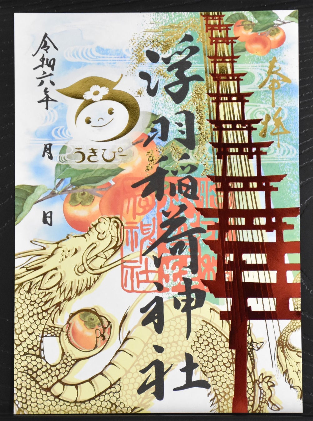 浮羽稲荷神社の鳥居、来年の干支の辰、うきぴーが箔押しされた御朱印となっています。